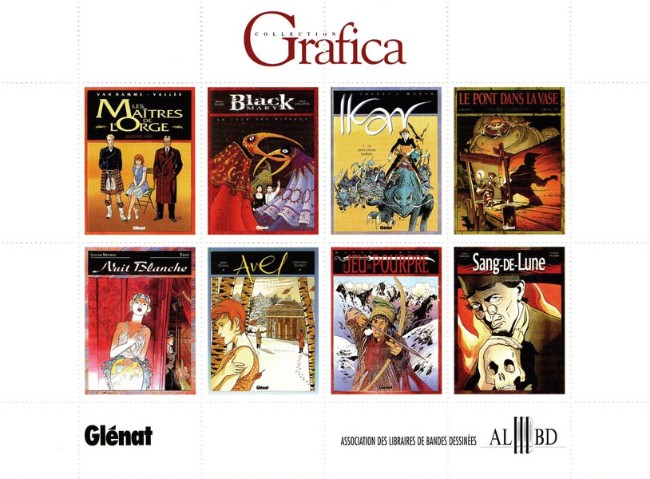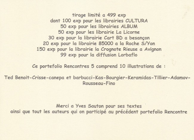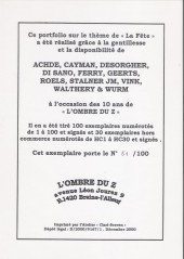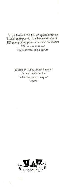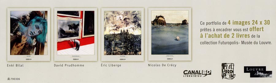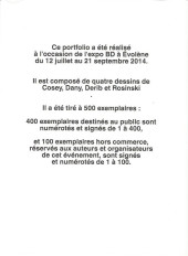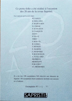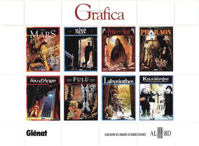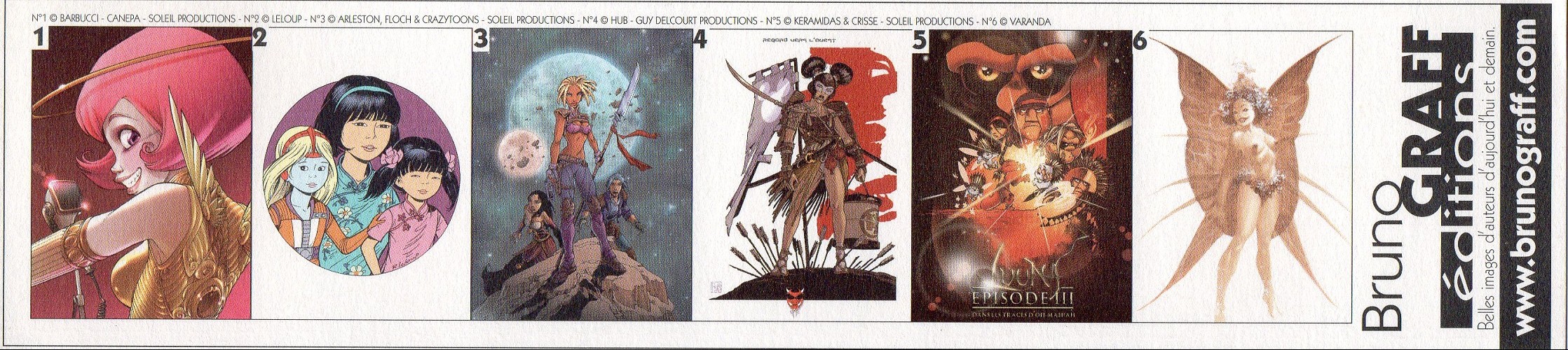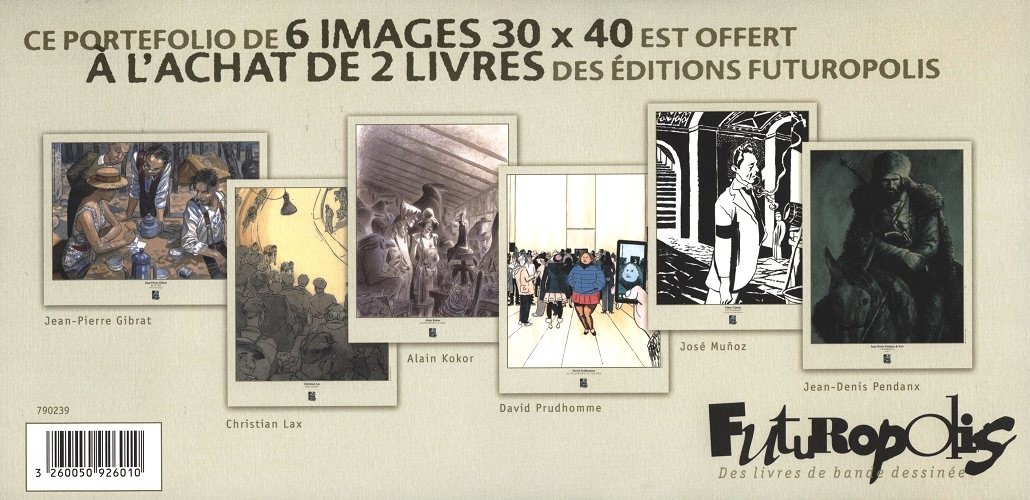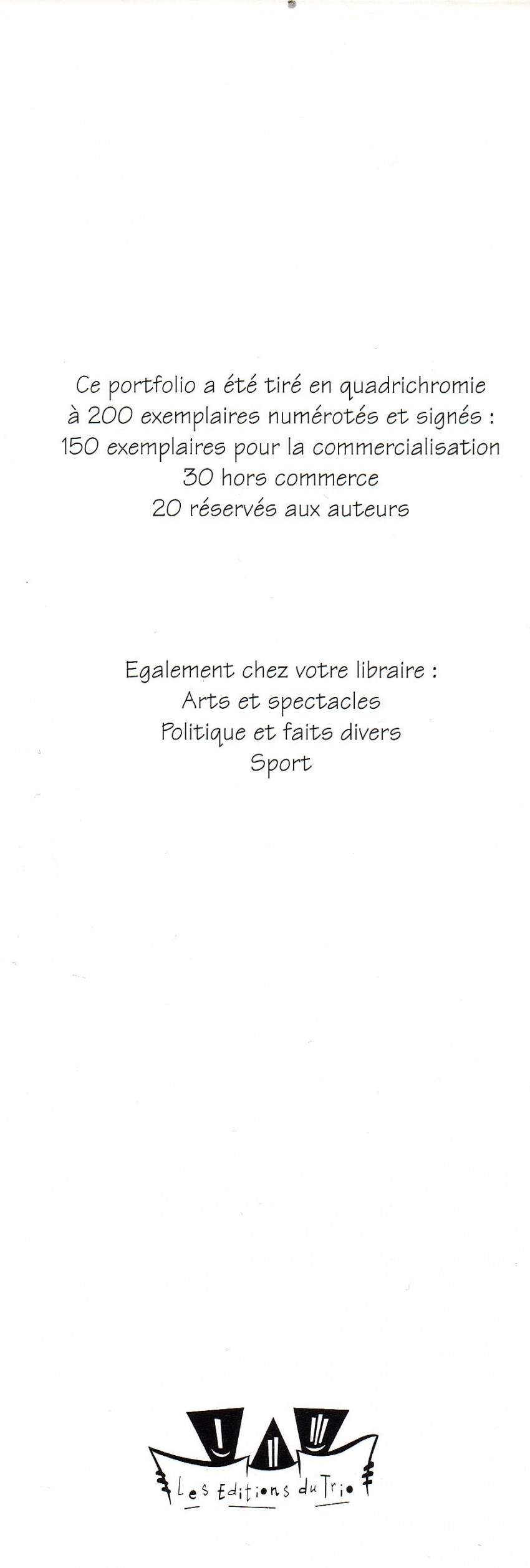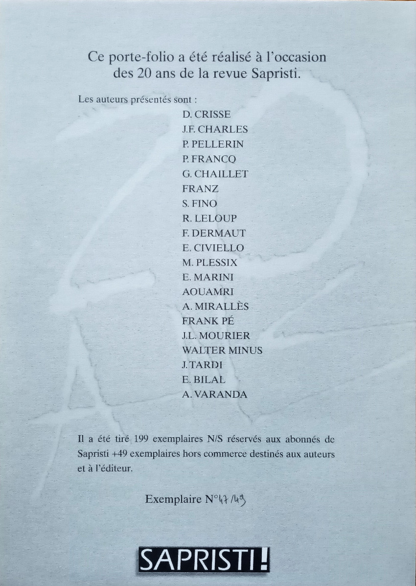 Commentaire : Ce portfolio, présenté sous la forme d'un dépliant, contient 18 illustrations (souvent reprises des couvertures) dessinées par Nicolas de Crécy, Marc-Antoine Mathieu, Éric Liberge, Bernard Yslaire, Hirohiko Araki, Christian Durieux, David Pruhomme, Enki Bilal, Étienne Davodeau, Jirô Taniguchi, Florent Chavouet,
