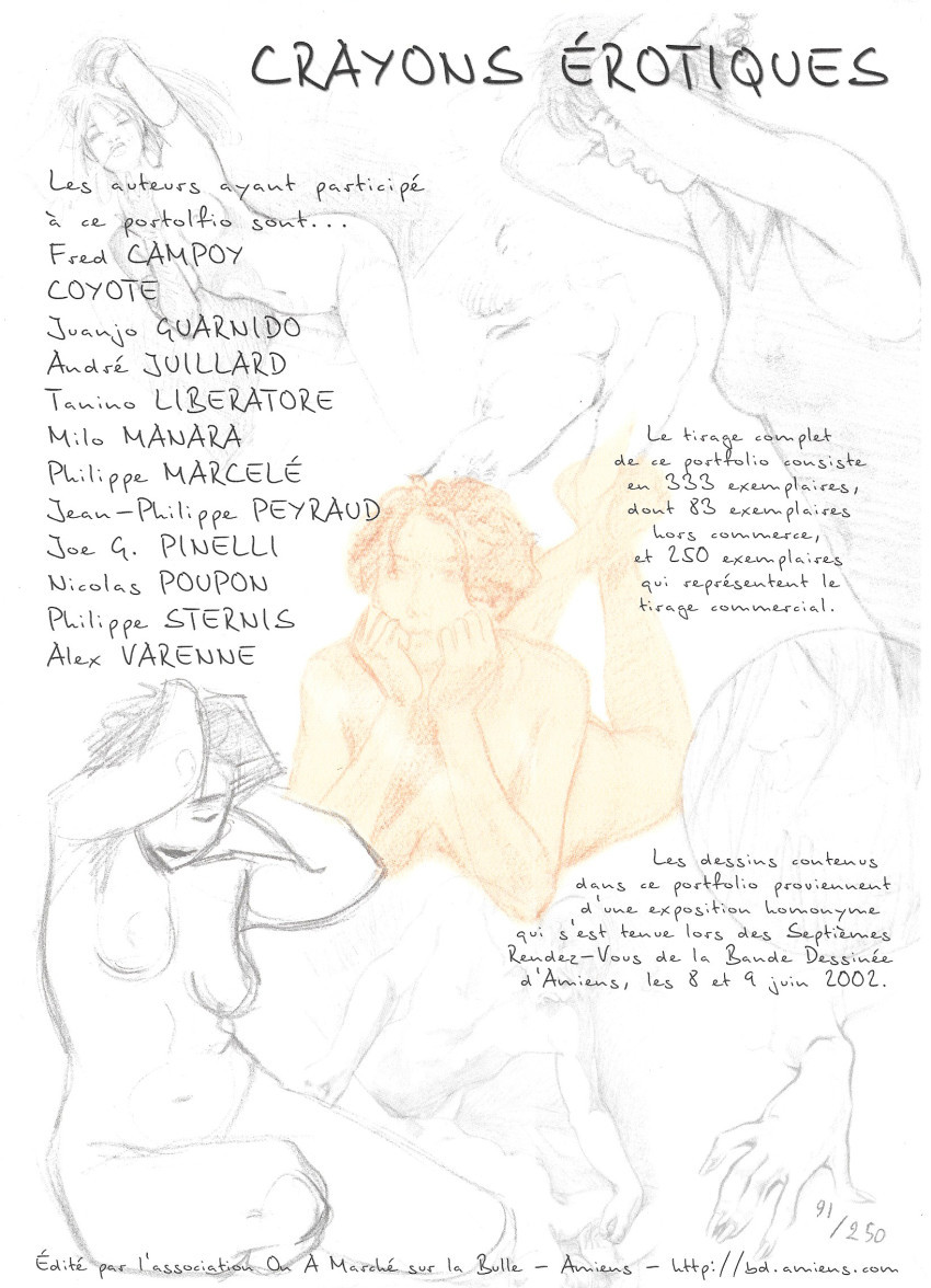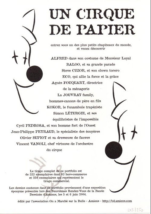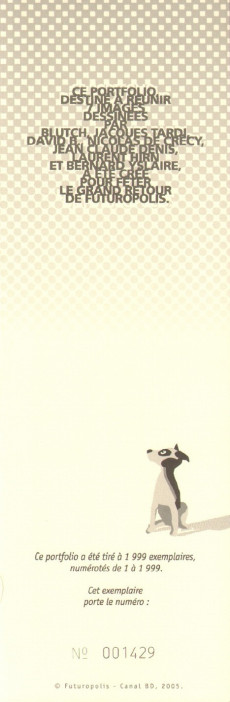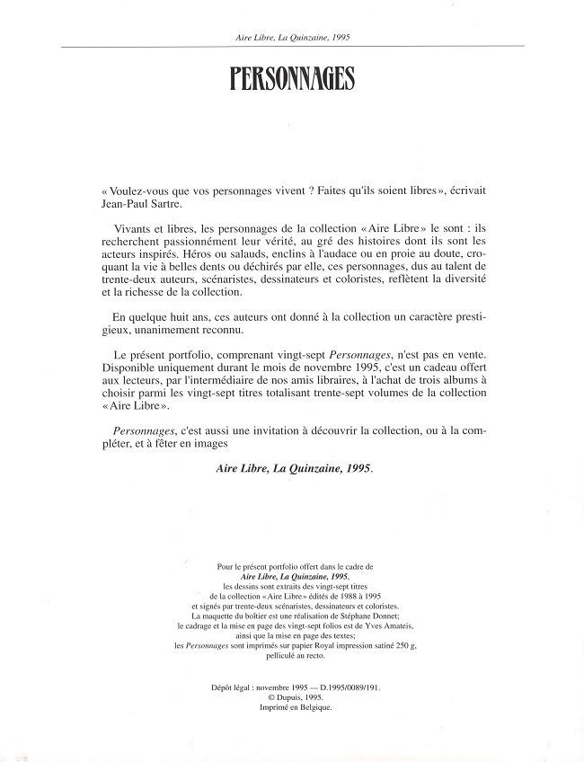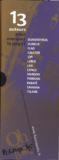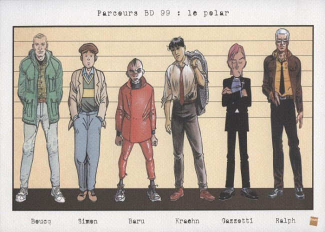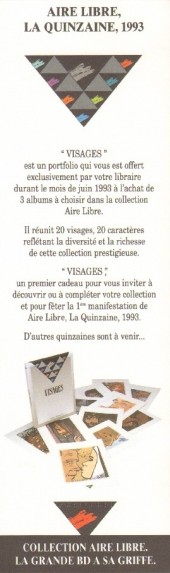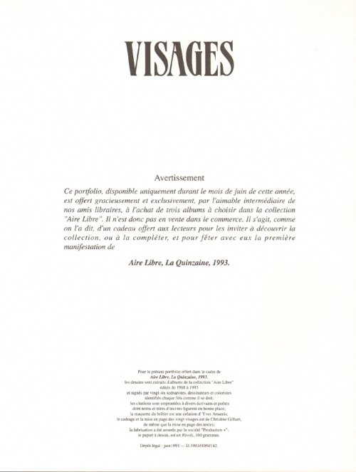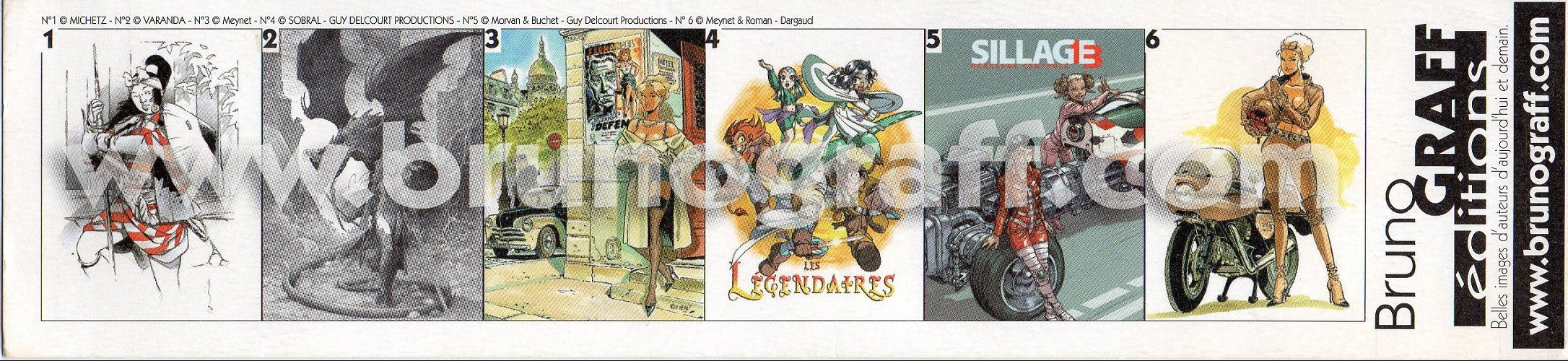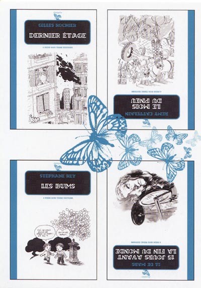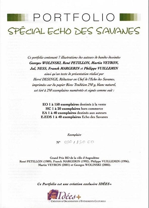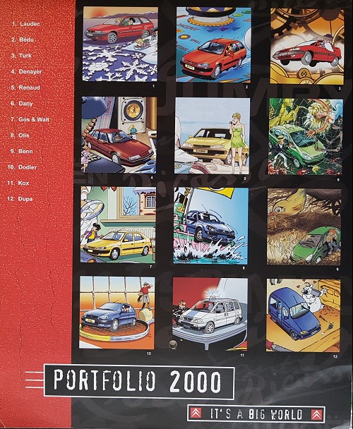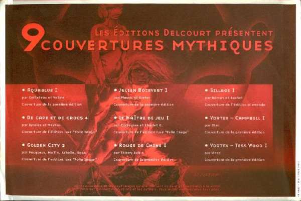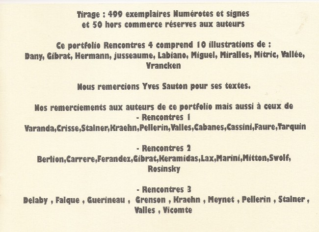 Commentaire : Ce portfolio, présenté sous la forme d'un dépliant, contient 18 illustrations (souvent reprises des couvertures) dessinées par Nicolas de Crécy, Marc-Antoine Mathieu, Éric Liberge, Bernard Yslaire, Hirohiko Araki, Christian Durieux, David Pruhomme, Enki Bilal, Étienne Davodeau, Jirô Taniguchi, Florent Chavouet,