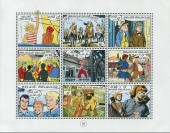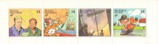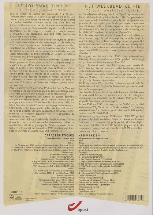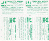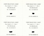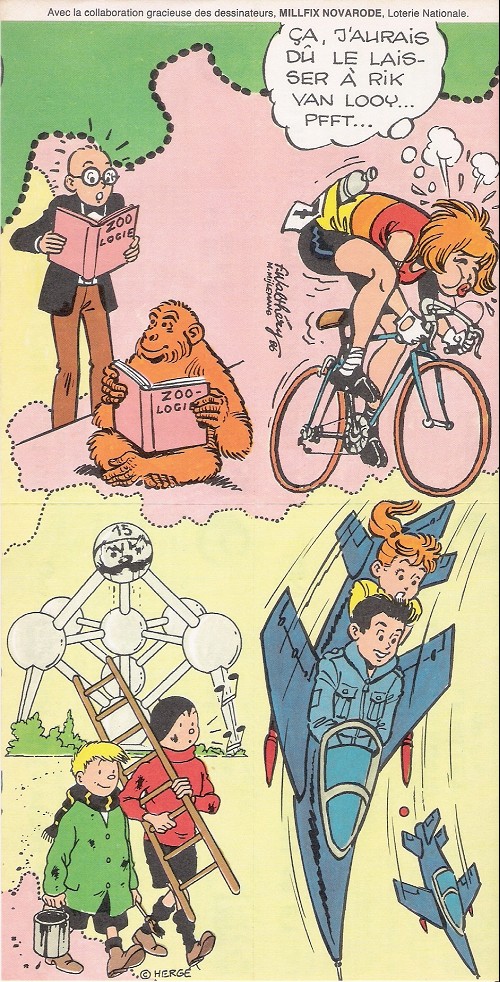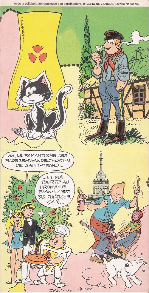 Commentaire : Planche de 4 autocollants. Au verso, il y a 4 tickets de tombola vendus par des bénévoles, tombola organisée par l'Opération 48.81.00 au profit des handicapés de Belgique et avec la participation de la Loterie Nationale. Fait partie d'un ensemble de 10 planches qui, assemblées, représentent la Belgique et ses sites remarquables (cf. visuel 2). Auteurs présents sur cette planche : Walthéry, Craenhals et Hergé.