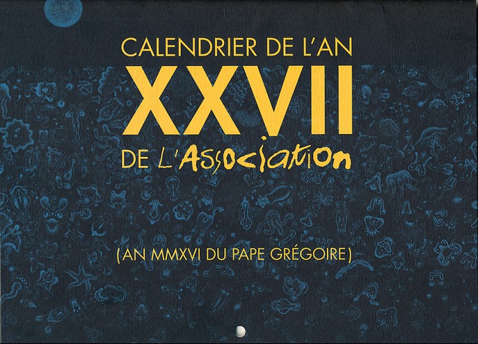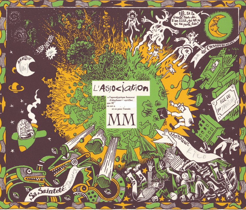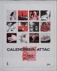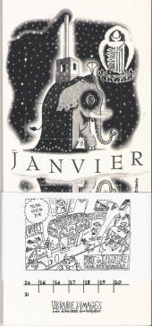 Commentaire : Calendrier réalisé collectivement par les auteur(e)s de la maison d'édition "Les Machines". Il se présente sous forme d'un cadavre exquis de 12 planches mensuelles composant une histoire complète. A noter : l'horoscope...