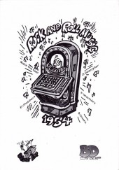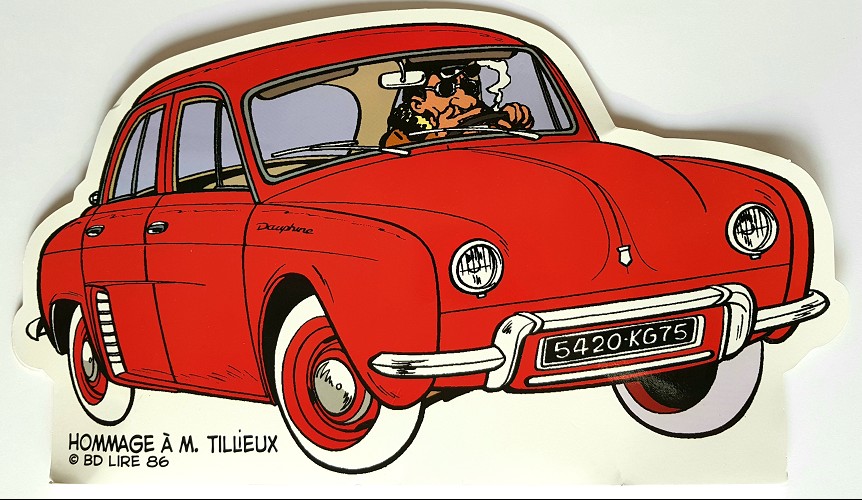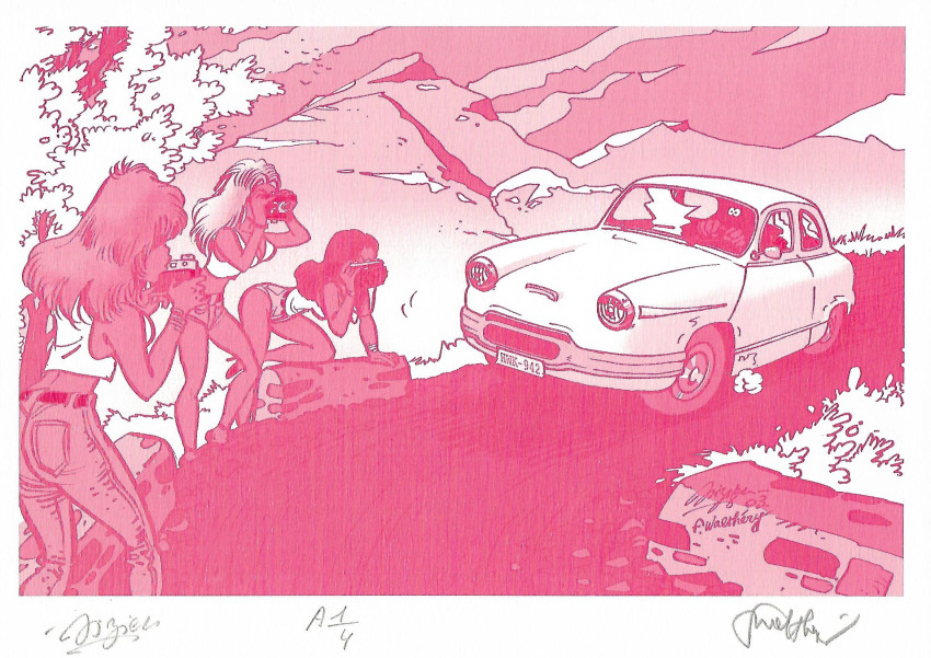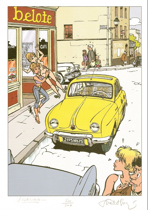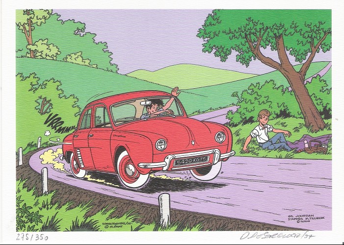 Commentaire : La "Renault Dauphine". Ex-libris faisant partie de la série "voiture" en couleur. Ces ex-libris sont réalisés par différents auteurs : F. Walthéry pour les décors et les pin-up, le ou les autres auteurs pour la voiture et d'autres éléments. Ici, Jean-Luc Delvaux. Signé par les 2 auteurs.