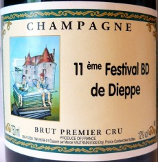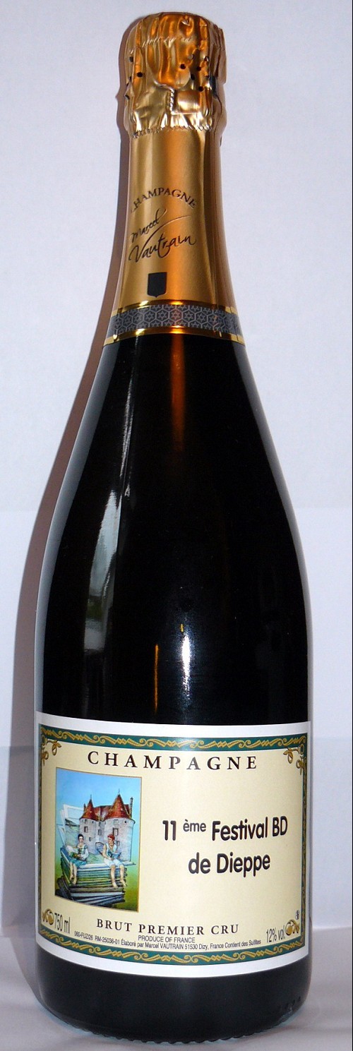 Commentaire : Champagne Marcel Vautrain avec une cuvée limitée à 300 bouteilles habillées avec étiquette réalisée à quatre mains par Béatrice TILLIER et Olivier BRAZAO. Le dessin de Béatrice TILLIER est tiré de la série "Le Bois des vierges" et le dessin d'Olivier BRAZAO est tiré de la série "Sheewõwkees". Sortie à l'occasion du 11ème festival BD de Dieppe du 4 au 6 octobre 2013.