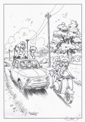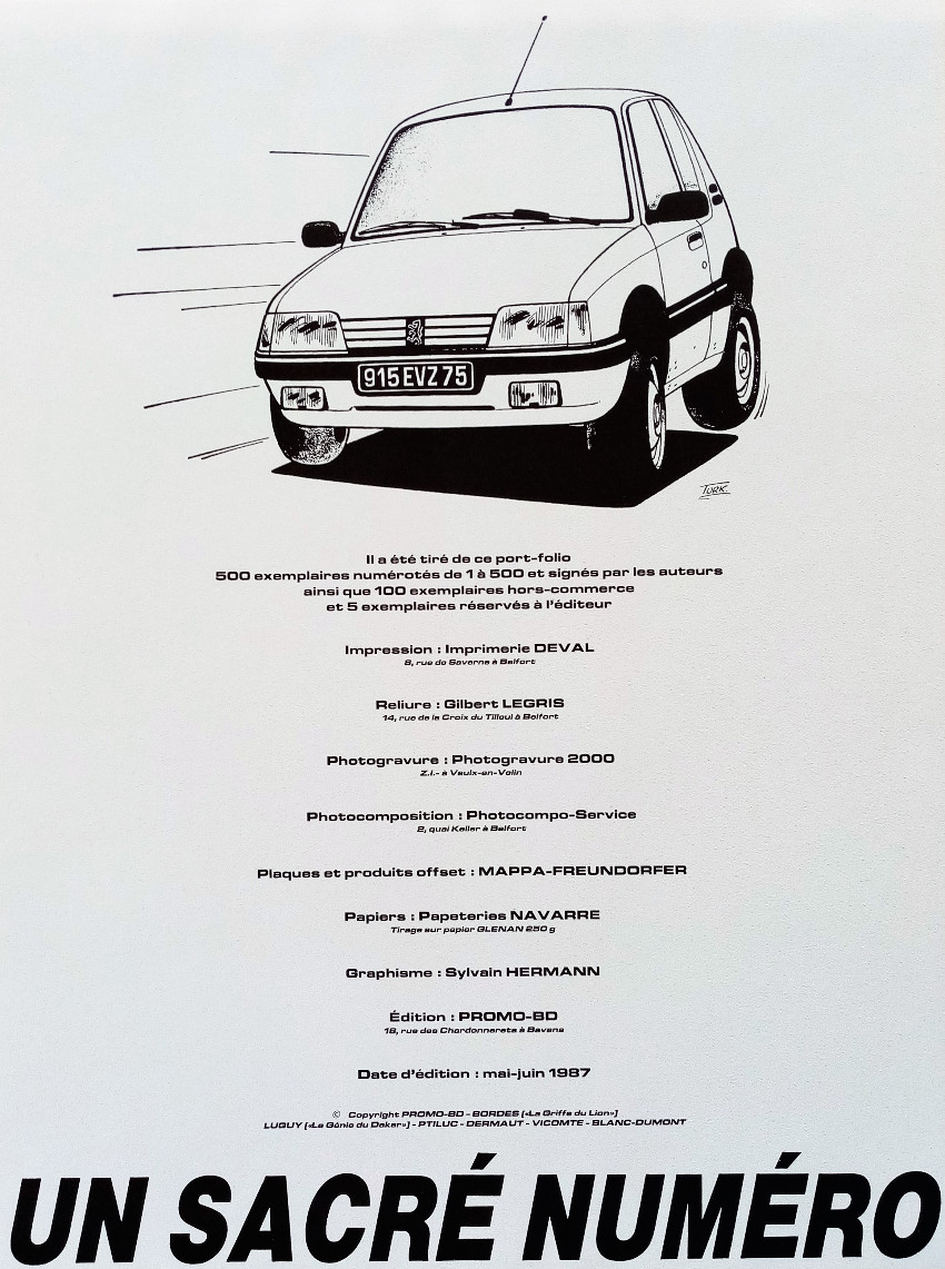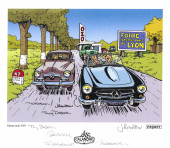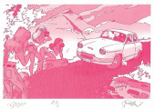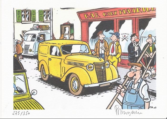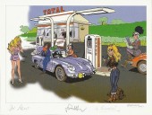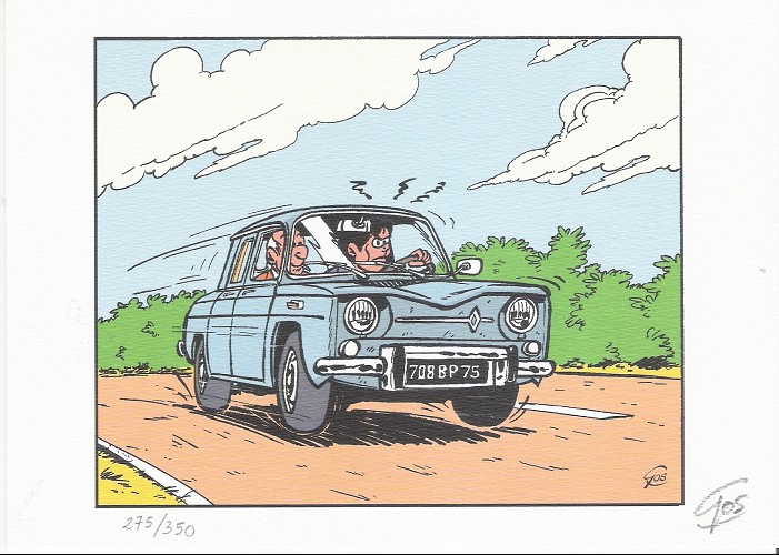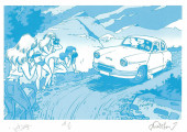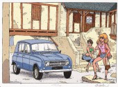 Commentaire : Fait partie des 14 illustrations contenues dans le portfolio. Frank Margerin - Renault Juva 4 - Surboum pour 4 roues.