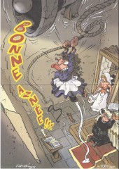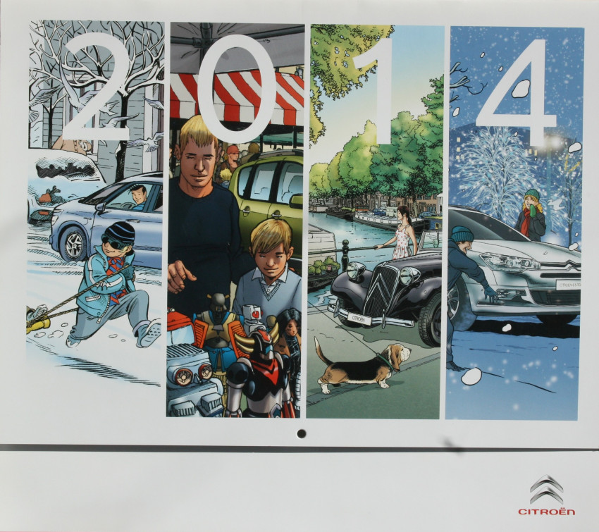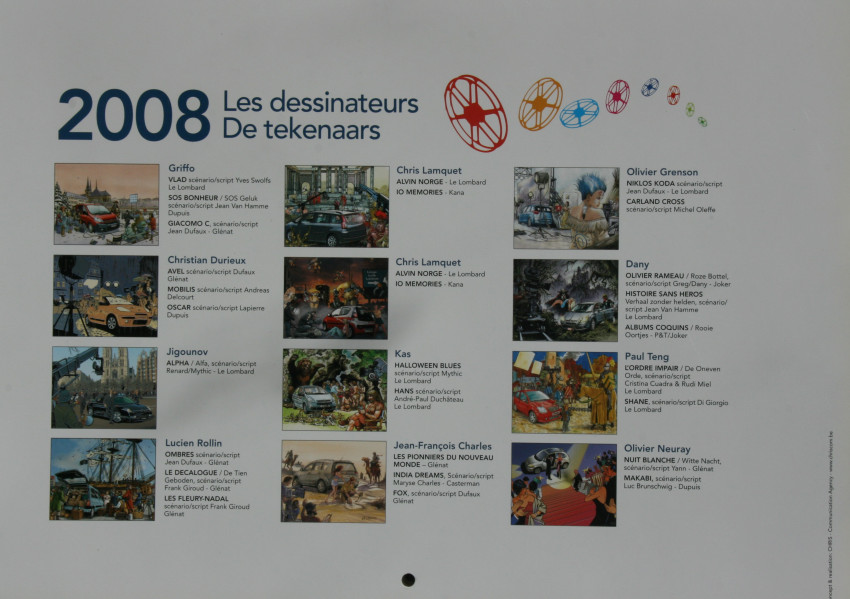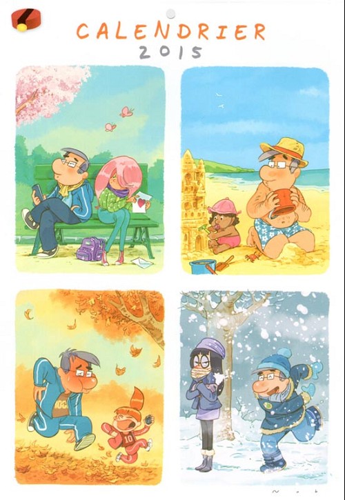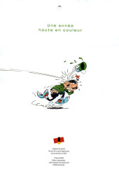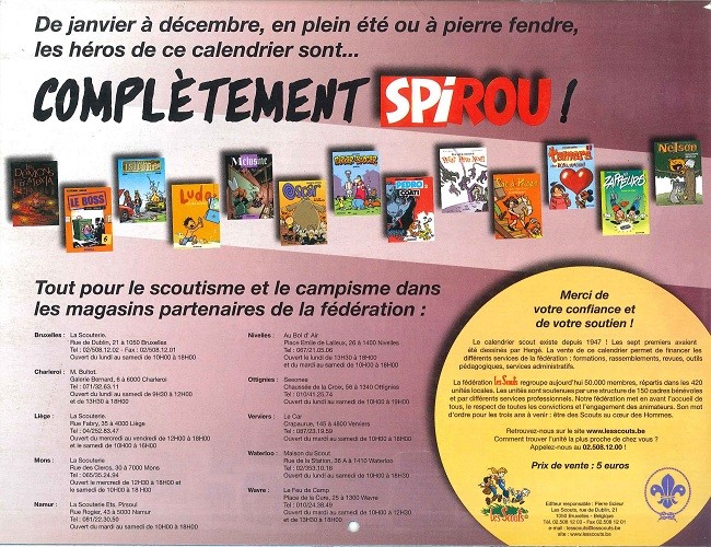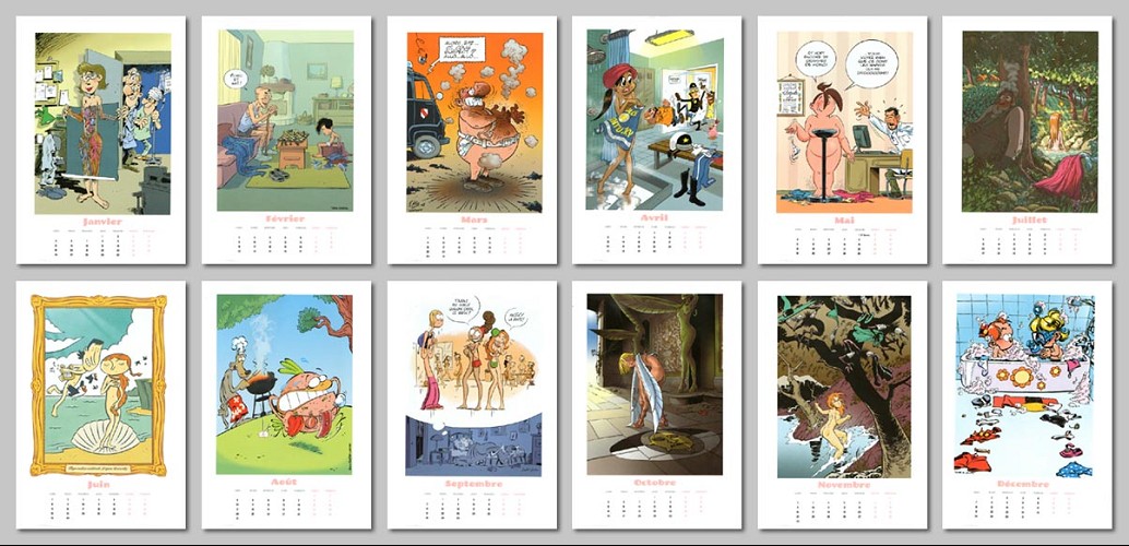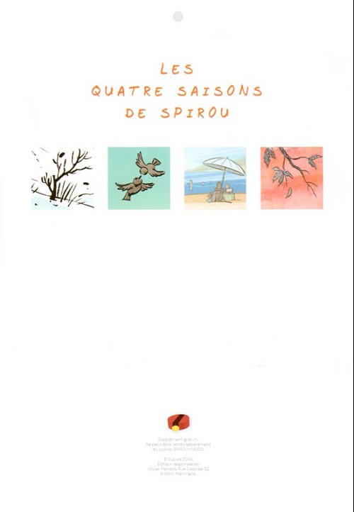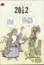 Commentaire : Calendrier offert avec le Spirou n° 3846 spécial nouvel an. Dessinateurs et scénaristes : Janvier : Kris - Duhamel - Croix (Les brigades du temps), Février : Madaule (Givrés!), Mars : Féroumont - Coopman (Le royaume), Avril : Cauvin - Bercovici - Léonardo (Les femmes en blanc), Mai : Tome - Janri - Dan - Stuf (Le petit Spirou), Juin : Delaf - Dubuc (Les nombrils), Juillet : Mazaurette - Krassinsky - Schwendimann (Sale bête), Août : Zidrou - Darasse - Bosse - Ben BK (Tamara), Septembre :Cuadrado (Parker et Badger), Octobre : Bertschy (Nelson), Novembre : Libon (Les cavaliers de l'Apocadispe), Décembre : Janry - Stuf (Passe-moi l'ciel).