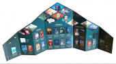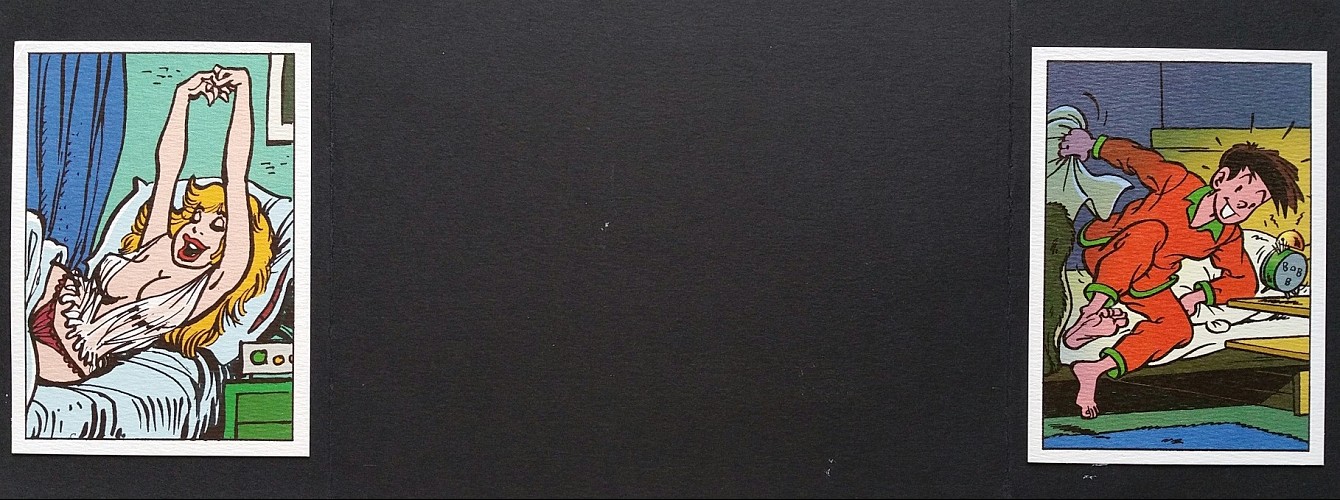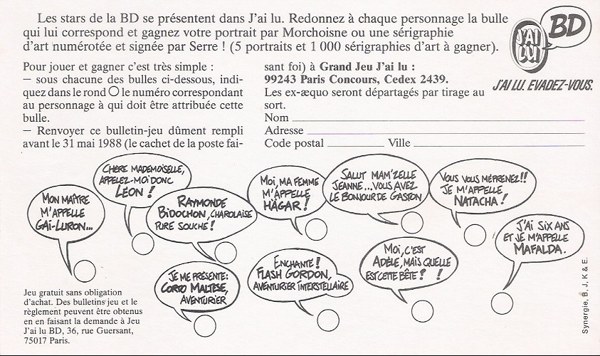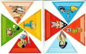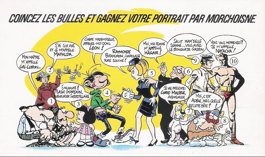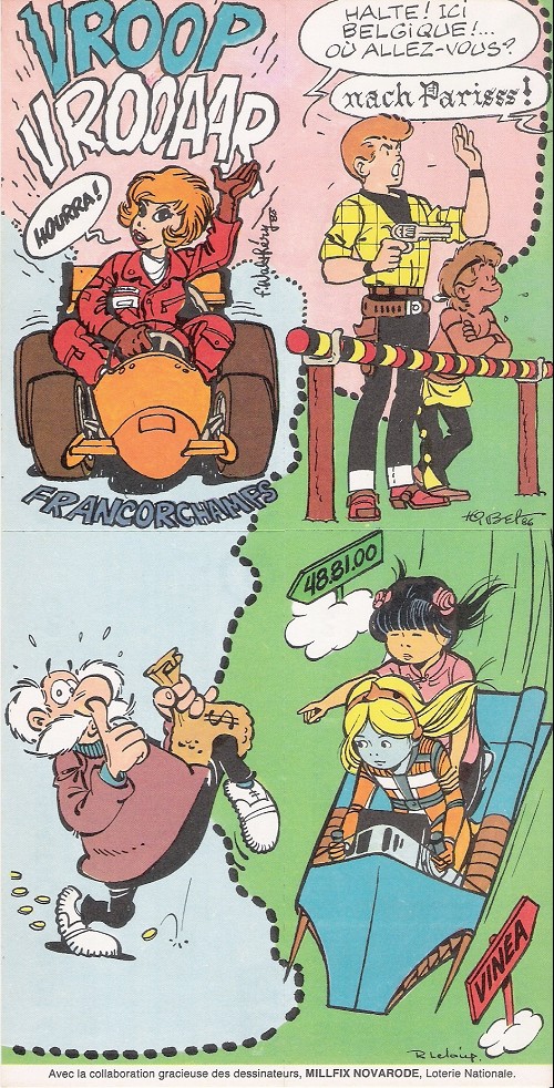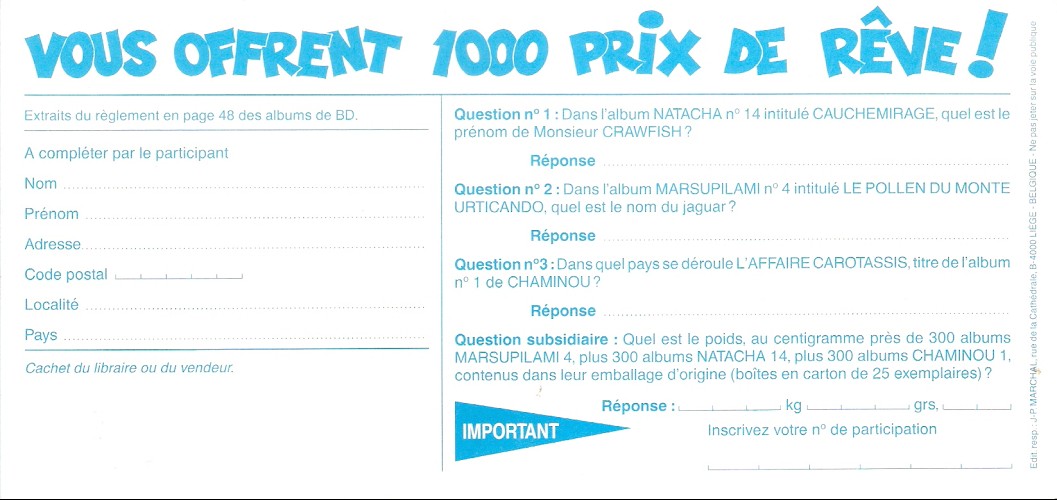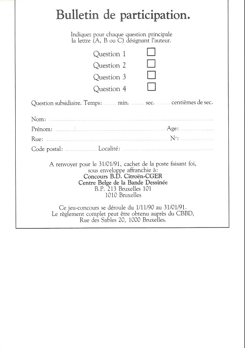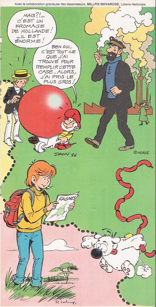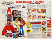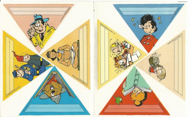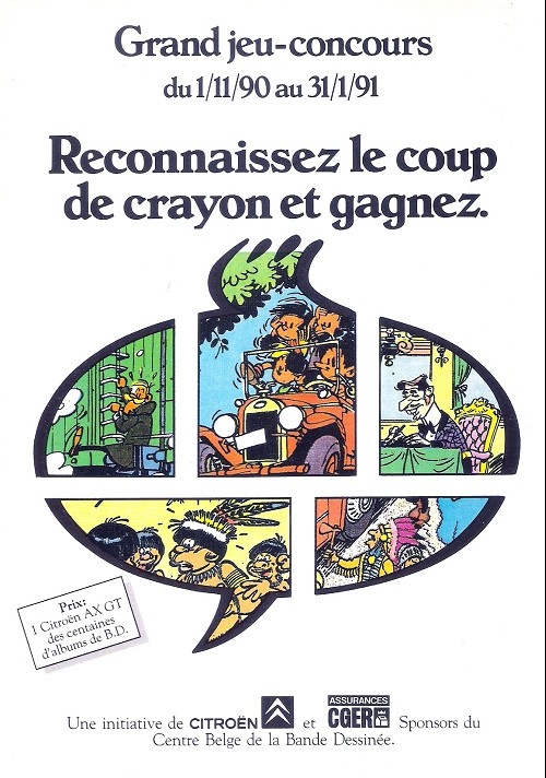 Commentaire : Jeu concours et bulletin de réponse sous forme de triptyque, avec des cases de Walthéry, Morris, Hergé, Turk et Franquin sur le recto et intérieur. Dimensions fermé.