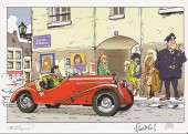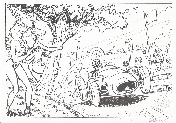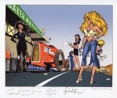 Commentaire : "La voiture de course ancienne". Ex-libris faisant partie de la série "voiture" en couleur. Ces ex-libris sont réalisés par différents auteurs : F. Walthéry pour les décors et les pin-ups, le ou les autres auteurs pour la voiture et d'autres éléments. Ici D. Desorgher, A. Taymans et M. Constant. Signé par les 4 auteurs.