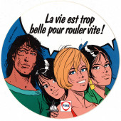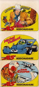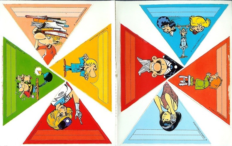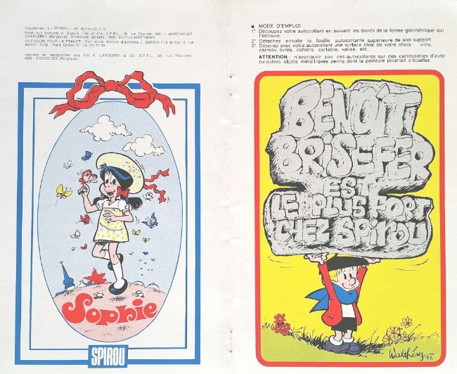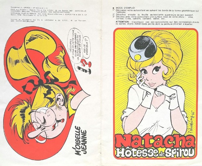 Commentaire : 2 planches de 2 autocollants chacune, offertes avec l'hebdomadaire Spirou n°1823 du 22/3/1973. Séries représentées : Gaston Lagaffe, Natacha, Sophie et Benoit Brisefer. Verso non imprimé.