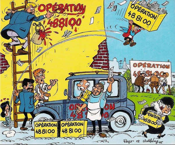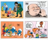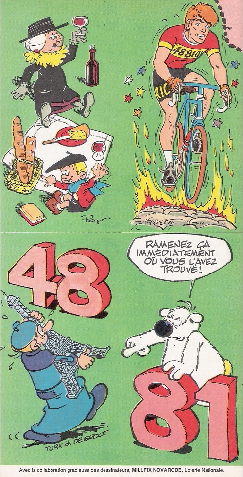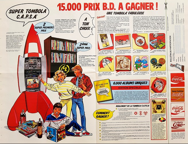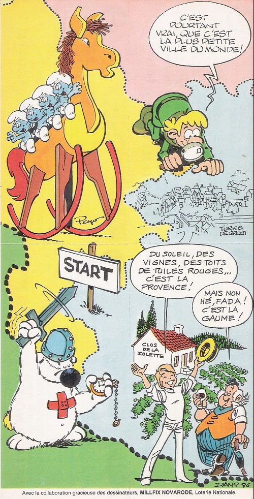 Commentaire : Planche de 5 autocollants, co-réalisée par Peyo et Walthéry. Il s'agit d'une version de pré-mise en vente, les numéros de tombola ne sont pas imprimés au verso et les billets ne sont pas découpés.