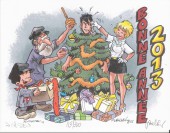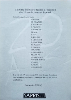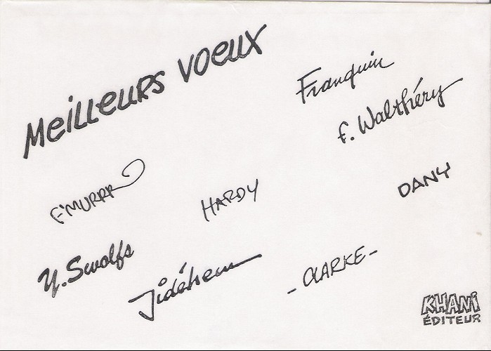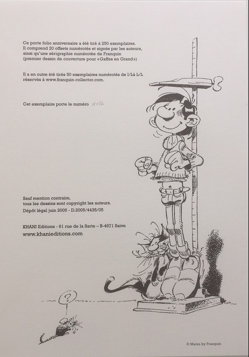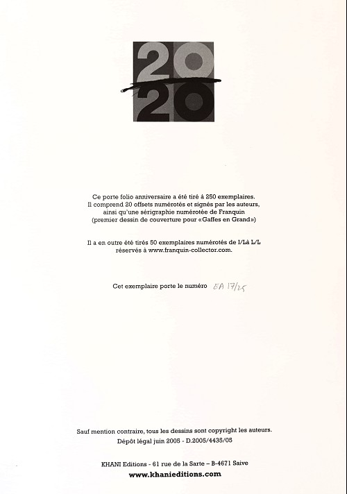Commentaire : Portfolio édité pour les 20 ans de Khani en 2005. Il comprend 20 illustrations inédites réalisées par 20 dessinateurs ayant collaboré avec Khani au cours des 20 années précédentes. Chaque illustration est numérotée et signée par son dessinateur : Berthet - Dany - Denayer - Francq - Frank Pé - Gazzotti - Grenson - Hardy - Hausman - Henriet - Janry - Lambil - Ralph Meyer - Meynet - Munuera - Servais - Swolfs - Vance - Vrancken - Walthéry. En bonus, une 21è illustration réalisée par Franquin représentant le premier dessin de couverture pour "Gaffes en Grand". Cette illustration n'est pas signée. Il existe un tirage EA à 25 exemplaires numéroté EA / 25. Il existe une variante tirée à 50 exemplaires avec une toile de couleur bleue.