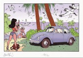 Commentaire : La "Coccinelle". Ex-libris faisant partie de la série "voiture" en couleur. Ces ex-libris sont réalisés par deux auteurs : F. Walthéry pour les décors et les pin-ups, l'autre auteur pour la voiture. Ici Eric Lenaerts. Il existe une version à 350 exemplaires signées par les deux auteurs, et une version à 200 exemplaires signées uniquement par F. Walthéry.