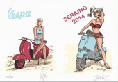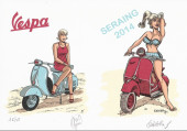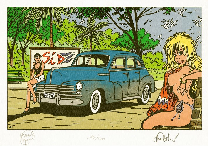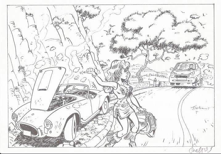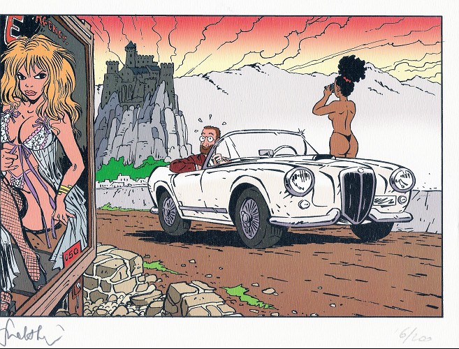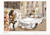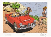 Commentaire : "L'Alfa Roméo Giulietta Cabriolet". Ex-libris faisant partie de la série "voiture" en couleur. Ces ex-libris sont réalisés par différents auteurs : F. Walthéry pour les décors et les pin-up, le ou les autres auteurs pour la voiture et d'autres éléments. Ici, JL. Delvaux. Signé par les 2 auteurs.