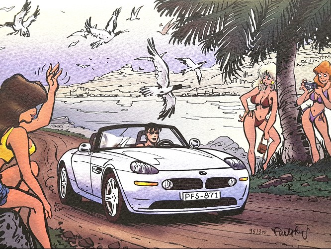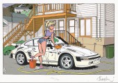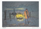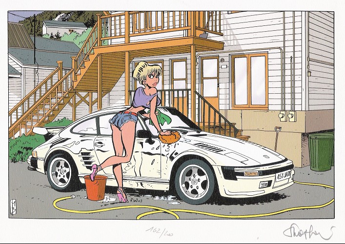 Commentaire : La "Porsche 911". Ex-libris faisant partie de la série "voiture" en couleur. Ces ex-libris sont réalisés par différents auteurs : F. Walthéry pour les décors et les pin-up, le ou les autres auteurs pour la voiture et d'autres éléments. Ici M. Bourgne. Signé par F. Walthéry. Il existe une version non numérotée mais signée par les 2 auteurs.