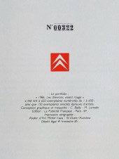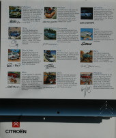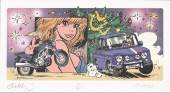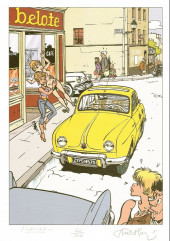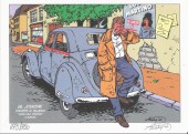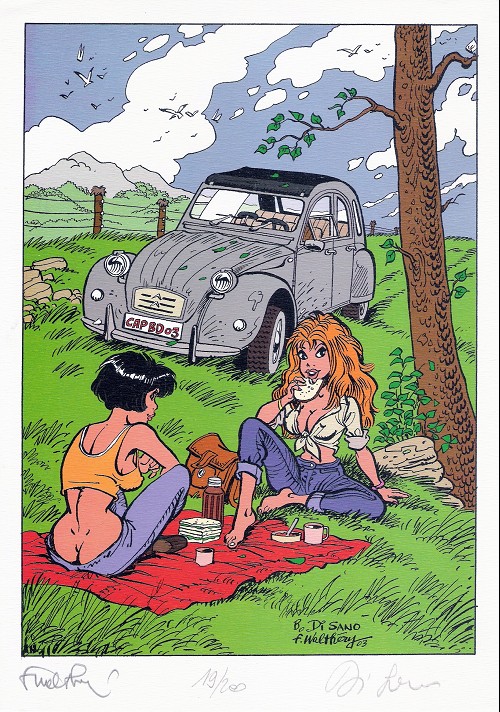 Commentaire : La "2 CV Citröen". Ex-libris faisant partie de la série "voiture" en couleur. Ces ex-libris sont réalisés par différents auteurs : F. Walthéry pour les décors et les pin-up, le ou les autres auteurs pour la voiture et d'autres éléments. Ici, Bruno Di Sano. Signé par les 2 auteurs.