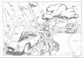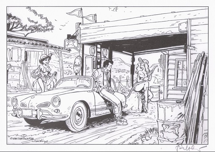 Commentaire : La "VW Karmann Ghia" . Ex-libris faisant partie de la série "voiture" en noir et blanc. Ces ex-libris sont réalisés par différents auteurs : F. Walthéry pour les décors et les pin-up, le ou les autres auteurs pour la voiture et d'autres éléments. Ici, G. van Linthout. Signé par F. Walthéry.