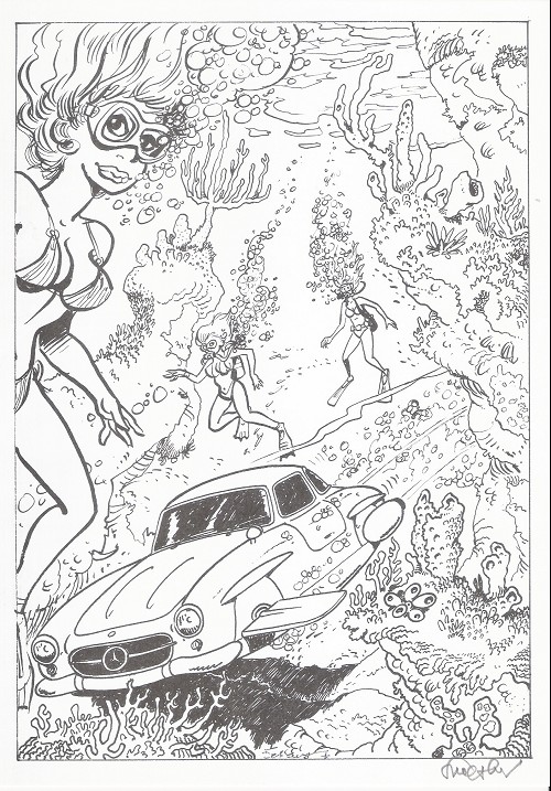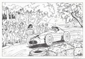 Commentaire : La "Mercedes 300 SL". Ex-libris faisant partie de la série "voiture" en noir et blanc. Ces ex-libris sont réalisés par différents auteurs : F. Walthéry pour les décors et les pin-up, le ou les autres auteurs pour la voiture et d'autres éléments. Ici, l'auteur collaborant avec Walthéry n'est pas identifié. Signé par F. Walthéry.