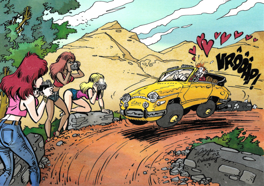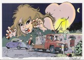Commentaire : Le "Toyota Land Cruiser". Ex-libris faisant partie de la série "voiture" en couleur. Ces ex-libris sont réalisés par différents auteurs : F. Walthéry pour les décors et les pin-up, le ou les autres auteurs pour la voiture et d'autres éléments. Ici? M. Wasterlain. Signé par les 2 auteurs.