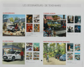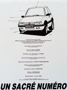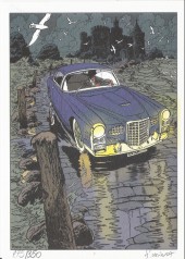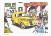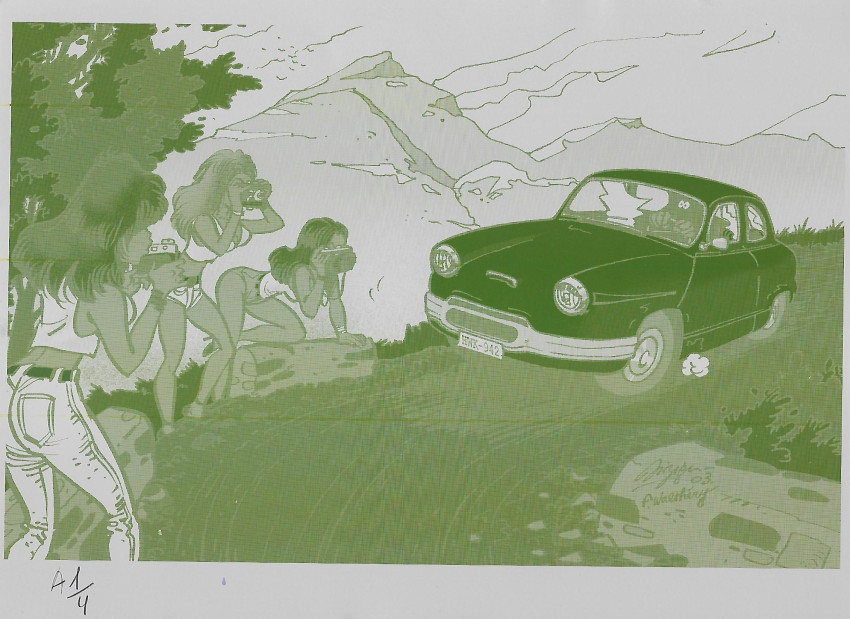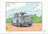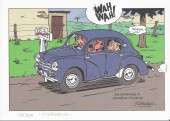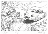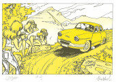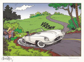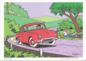 Commentaire : La "Panhard PL 17". Ex-libris faisant partie de la série "voiture". Ces ex-libris sont réalisés par différents auteurs : F. Walthéry pour les décors et les pin-up, le ou les autres auteurs pour la voiture et d'autres éléments. Ici, Stéphane DIZIER. Numéroté A x/4.