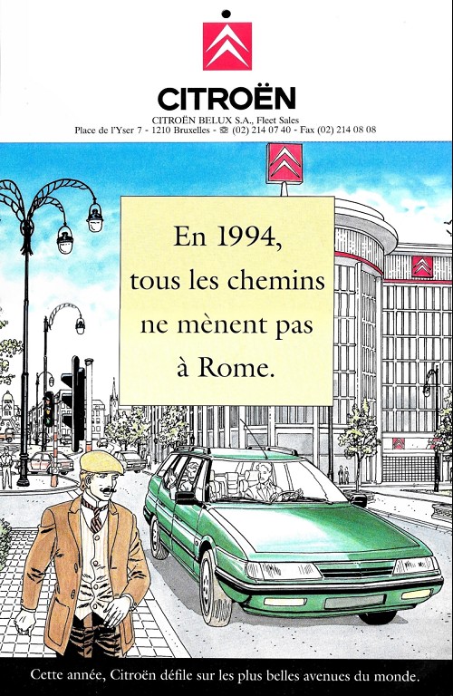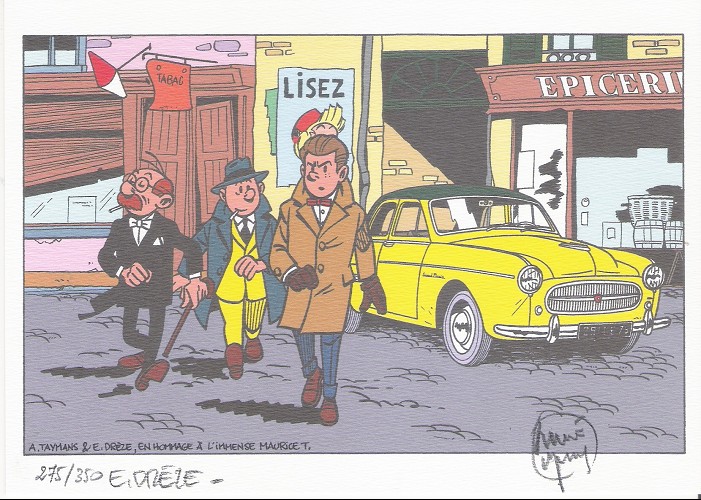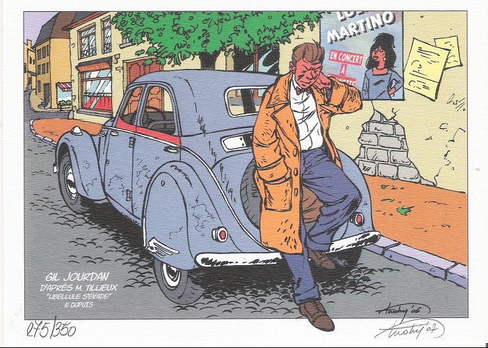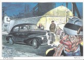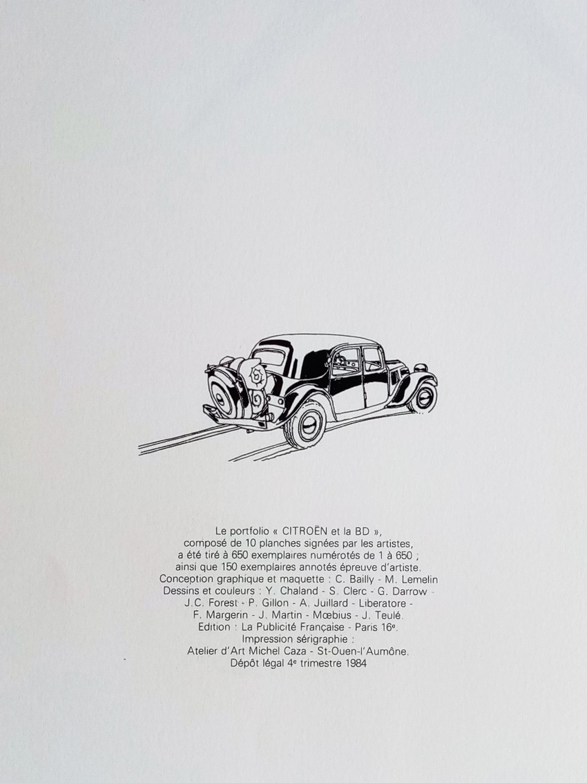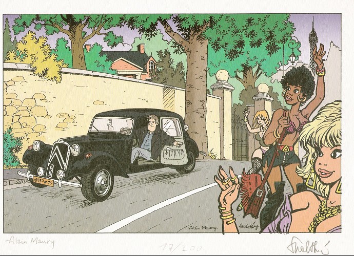 Commentaire : La "Traction Citröen". Ex-libris faisant partie de la série "voiture" en couleur. Ces ex-libris sont réalisés par différents auteurs : F. Walthéry pour les décors et les pin-up, le ou les autres auteurs pour la voiture et d'autres éléments. Ici, Alain Maury. Signé par les 2 auteurs.