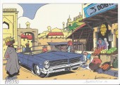 Commentaire : La "Cadillac 62 Serie". Ex-libris faisant partie de la série "voiture" en couleur. Ces ex-libris sont réalisés par différents auteurs : F. Walthéry pour les décors et les pin-up, le ou les autres auteurs pour la voiture et d'autres éléments. Ici, André Taymans. Signé par les 2 auteurs.