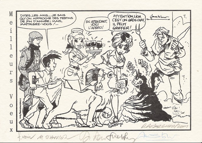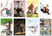 Commentaire : Pas de verso ni certificat. Contient 9 cartes postales signées : Cuvelier, Dineur, Jijé, Laudy, Michel Leloup, Mitacq, Sirius, Tillieux & Hubinon.