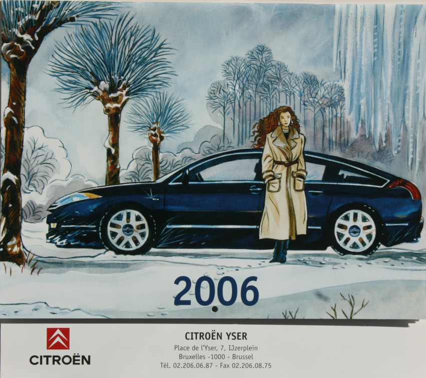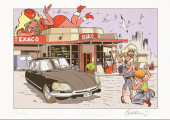 Commentaire : La "Citröen DS". Ex-libris faisant partie de la série "voiture" en couleur. Ces ex-libris sont réalisés par différents auteurs : F. Walthéry pour les décors et les pin-up, le ou les autres auteurs pour la voiture et d'autres éléments. L'autre auteur n'est pas identifié. Signé par les 2 auteurs.