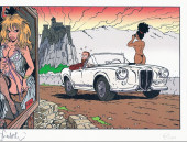 Commentaire : [Voiture non identifiée]. Ex-libris faisant partie de la série "voiture" en couleur. Ces ex-libris sont réalisés par différents auteurs : F. Walthéry pour les décors et les pin-up, le ou les autres auteurs pour la voiture et d'autres éléments. L'autre auteur n'est pas identifié. Signé par Walthéry.