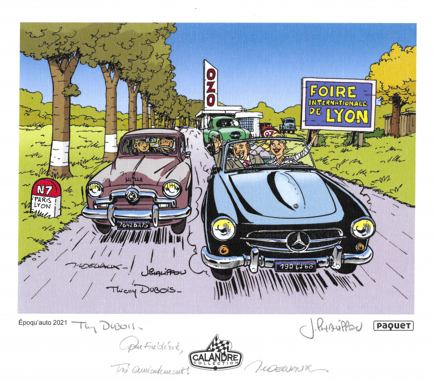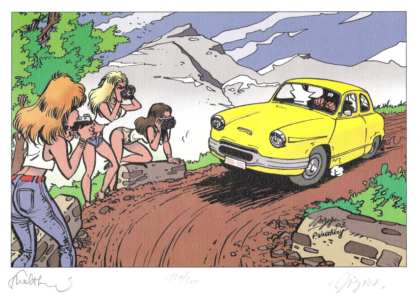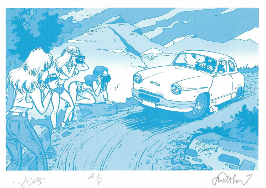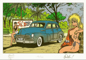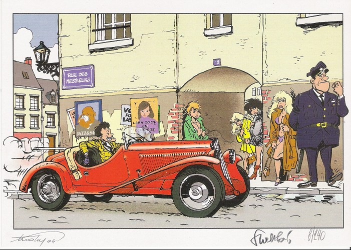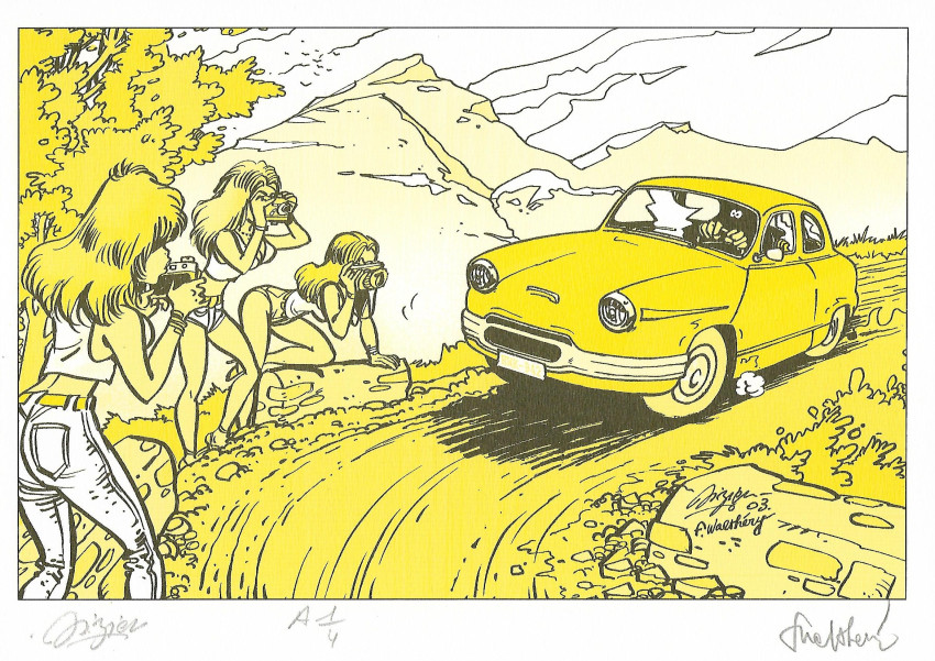 Commentaire : La "Panhard PL 17". Ex-libris faisant partie de la série "voiture" en couleur. Ces ex-libris sont réalisés par différents auteurs : F. Walthéry pour les décors et les pin-up, le ou les autres auteurs pour la voiture et d'autres éléments. Ici, Stéphane DIZIER. Signé par les 2 auteurs. Il existe un tirage à 4 exemplaires, numéroté A 1/4 à A 4/4. Cette numérotation "A" présente différentes variantes de cet ex-libris.