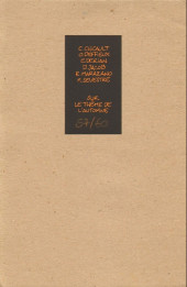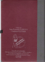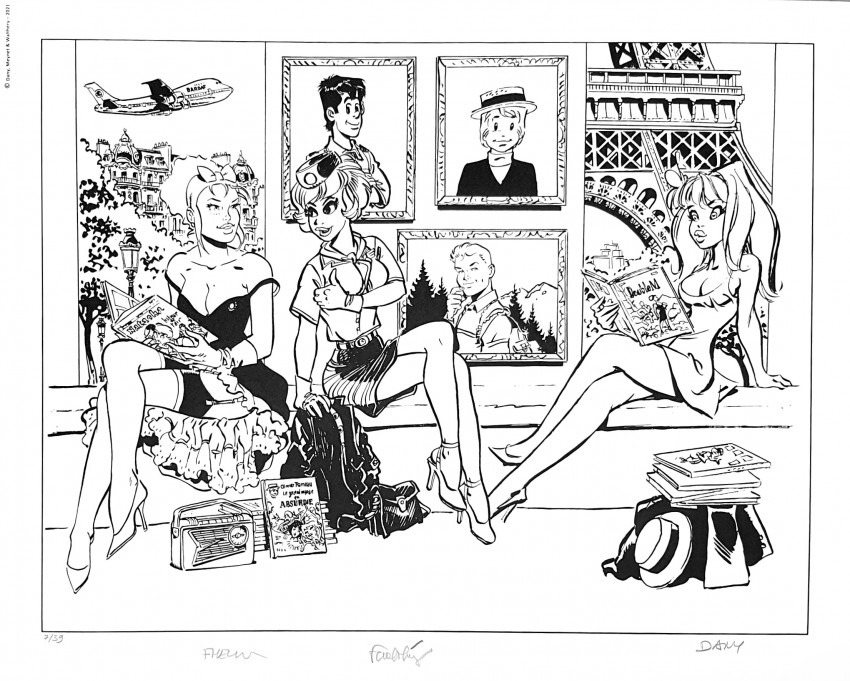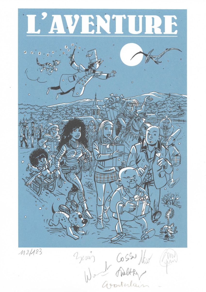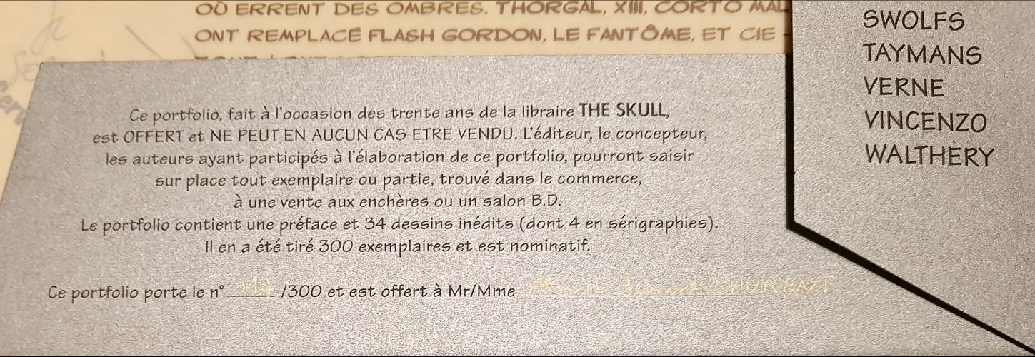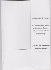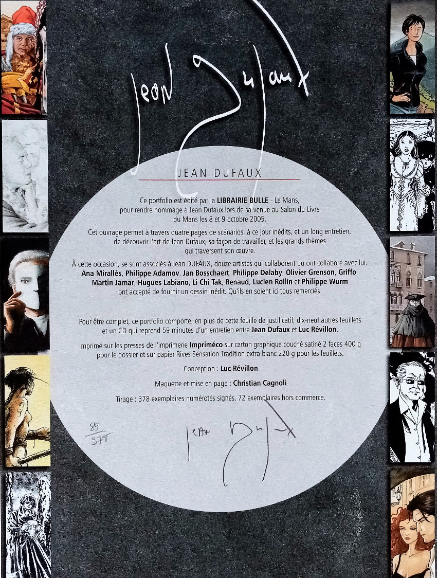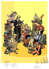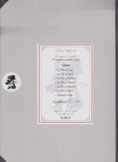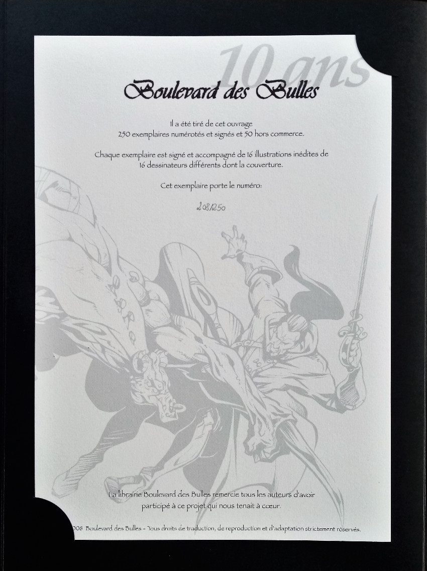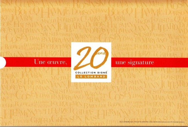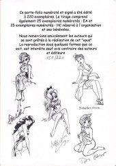 Commentaire : Le coffret contient 1 planche titre numérotée et 15 illustrations numérotées signées de 15 auteurs différents (Philippe Berthet, François Walthéry, J.F. et Maryse Charles, André Taymans, Virginie Augustin, Anthony Jean, Mohamed Aouamri, Franck Pé, Al Séverin, Florence Magnin, Philippe Francq, Eric Stalner, Béatrice Tillier, Félix Meynet, Nicolas Kéramidas et Alex Alice.). Chaque illustration est détachable de sa page. La couverture de Anthony Jean est signée.