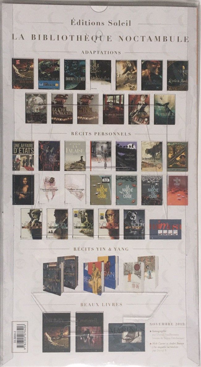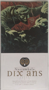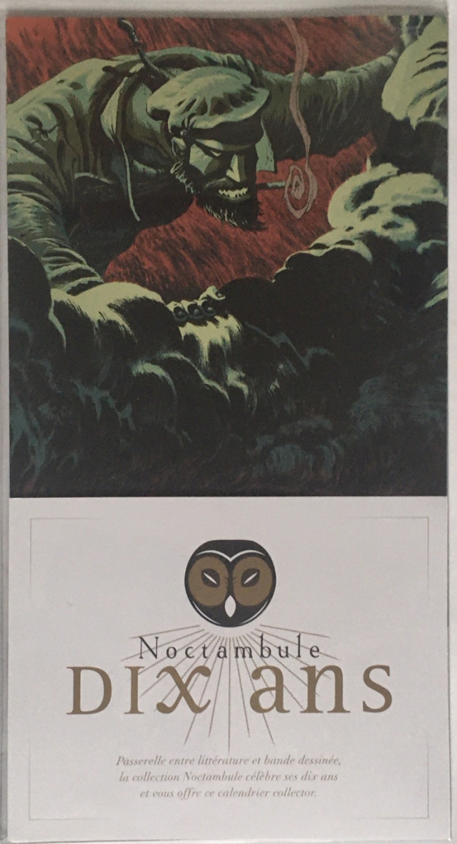 Commentaire : Calendrier pour les 10 ans de la collection "Noctambule". Contient 1 page d'entête, 12 pages recto-verso pour les mois, 1 page de rappel de "La bibliothèque Noctambule", le tout dans une pochette transparente rigide de présentation verticale ou suspendu. Les albums et auteurs : Loup des Mers (Le) (Riff Reb's) - Vagabond des Étoiles (Le) (Riff Reb's) - No Body (De Metter, Christian) - Babybox (Jung) - Dernier des Mohicans (Le) (Cromwell) - Au pied de la falaise (ByMöko) - Joueur (Le) (Godart, Loïc) - Club du Suicide (Le) (Vaccaro, Eddy) - Emma G. Wildford (Édith) - Jardin de minuit (Le) (Édith) - Léonard et Salaï (Lacombe, Benjamin) - Courant d'art (Le) (Bézian, Frédéric) - Moby Dick (Alary, Pierre) - Marche du crabe (La) (De Pins, Arthur) - Vincent, mon frère mort-vivant (Martin, Thierry) - Cheval d'Orgueil (Le) (Lizano, Marc) - Dernière image (La) (Jakupi, Gani) - Croisade des innocents (La) (Cruchaudet, Chloé) - L'herbier sauvage (Cruchaudet, Chloé) - Fenêtres sur rue (Rabaté, Pascal) - Nick Carter et André Breton (David B.) - Un monde flottant (De Crécy, Nicolas) - Sumographie (Prudhomme, David).