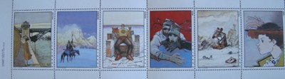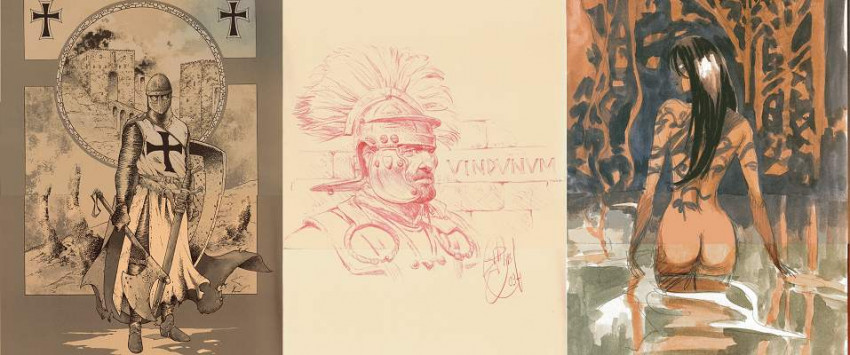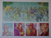 Commentaire : Enveloppe contenant 10 illustrations (Makashi pour Gon, Chauzy pour Un monde merveilleux, Constant pour Bitume, Wurm pour Le Cercle des sentinelles, Taymans pour Caroline Baldwin, Sokal pour Canardo, Tito pour Soledad, Rossi pour Jim Cuts, Warnauts pour Les Suites Vénitiennes, et Ferrandez pour Carnets d'Orient).