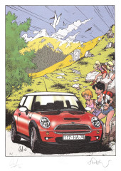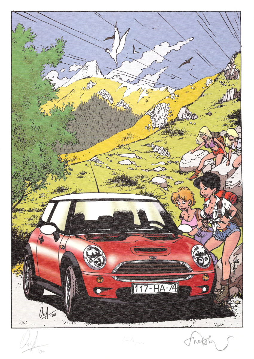 Commentaire : La "Mini". Ex-libris faisant partie de la série "voiture" en couleur. Ces ex-libris sont réalisés par différents auteurs : F. Walthéry pour les décors et les pin-up, le ou les autres auteurs pour la voiture et d'autres éléments. Ici, André OSI. Signé par les 2 auteurs.