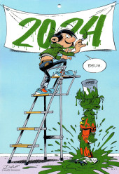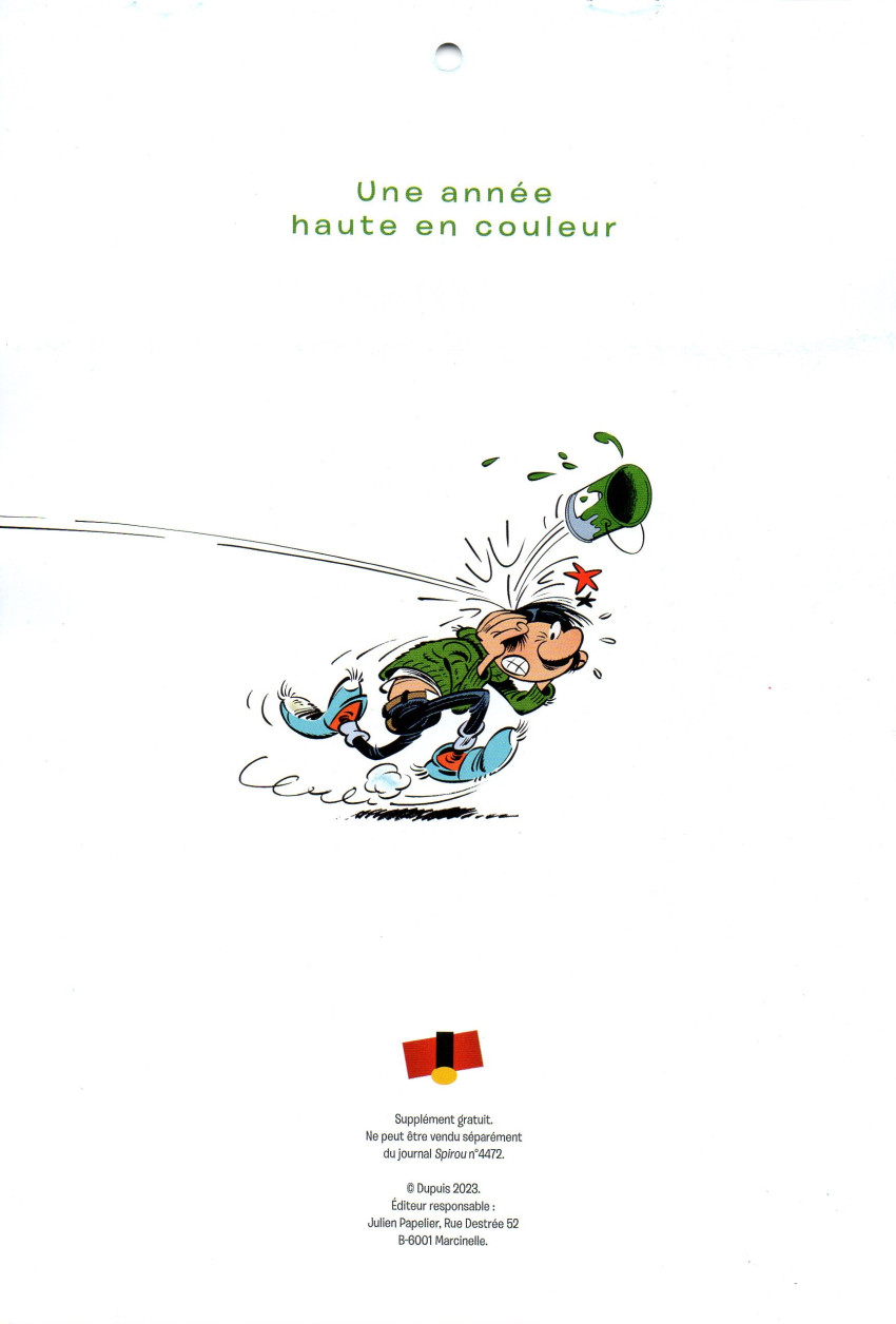 Commentaire : Supplément du Journal de Spirou n° 4472 du 27/12/2023. Couverture et dos : Delaf d'après Franquin (Gaston Lagaffe - Janvier : Libon (Les cavaliers de l'apocadipse) - Février : Cédric Mayen & Madd (Poltron Minet) - Mars : Benoît Feroumont (Le royaume) - Avril : Olivier Bocquet & Brice Cossu (Dad) - Mai : Abiton, Guerrive & Schwartz (Spirou et Fantasio) - Juin : BeKa & Munuera (Les cœurs de ferraille) - Juillet : Di Gregorio & Barbucci (Les sœurs Grémillet) - Août : Jocelyn Boisvert & Pascal Colpron (Mort et déterré) - Septembre : Théo Grosjean (Elliot du collège) - Octobre : Nob (Dad) - Novembre : Carine Barth & Cyrille Pomès (Lieutenant Bertillon) - Décembre : Bertschy (Nelson).
