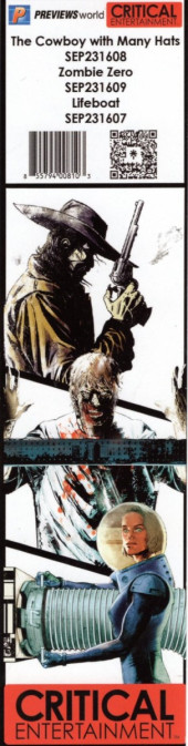 Commentaire : Marque-page reprenant partiellement les couvertures de : The Cowboy with Many Hats (Le cowboy aux nombreux chapeaux) Written by: Christopher Reda Illustrated by: Tadd Galusha & Zombi Zero 1 of 7 : M. Bear (Zombi Zéro Chapitre 1 sur 7 : M. Bear) Written by: Christopher Reda Illustrated by: Leandro Rizzo Lettered by: Travis Lanham Assistant Edited by: Mason Mendoza & Lifeboat (Canot de sauvetage) Written by: Mason Mendoza Illustrated by: Leandro Rizzo Lettered by: Kathryn S. Renta