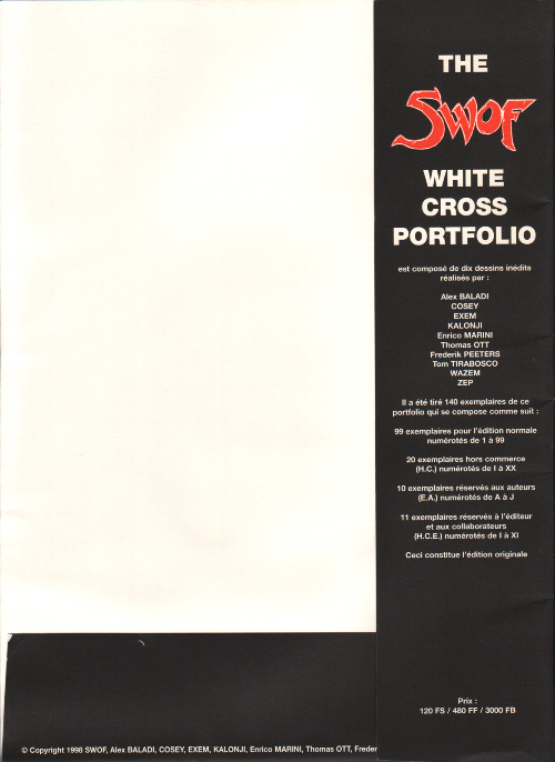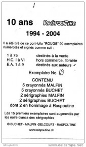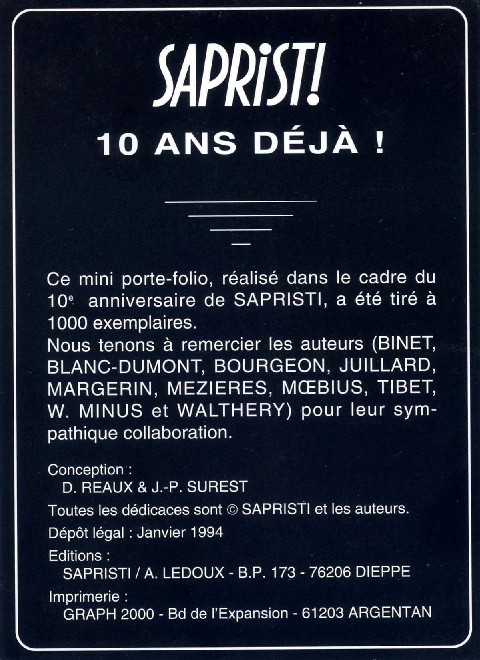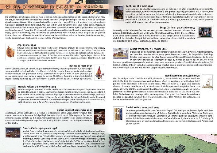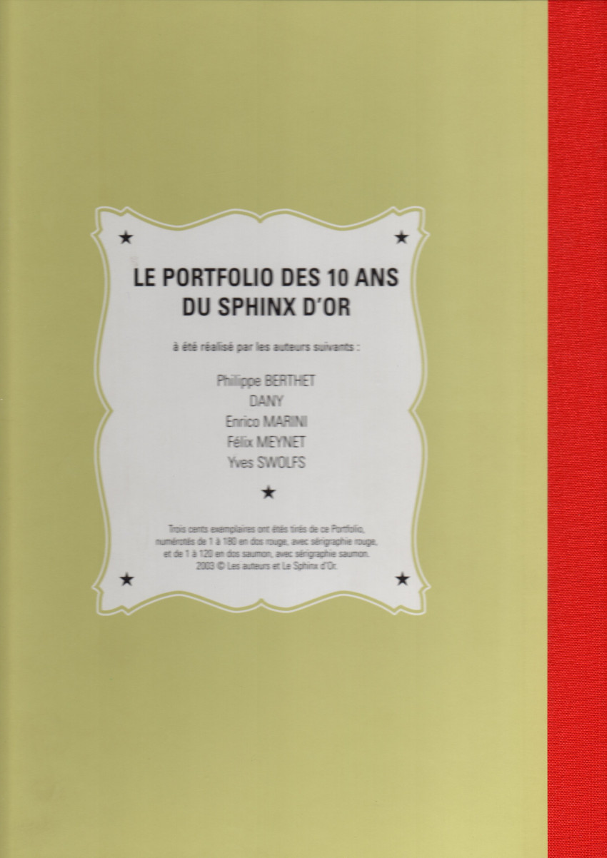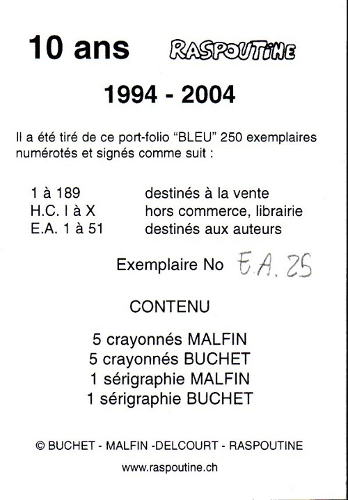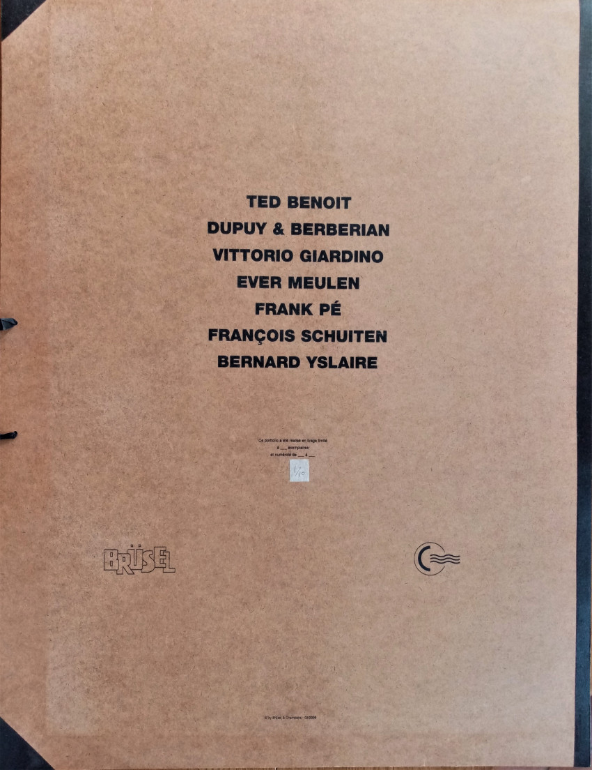 Commentaire : Portfolio réalisé à l'occasion du 10e anniversaire du BD Club de Genève. Tirage 500 exemplaires. Chemise souple contenant 10 dessins non numérotés et non signés et 2 feuillets descriptifs. Pas d'indication du mois de parution.
