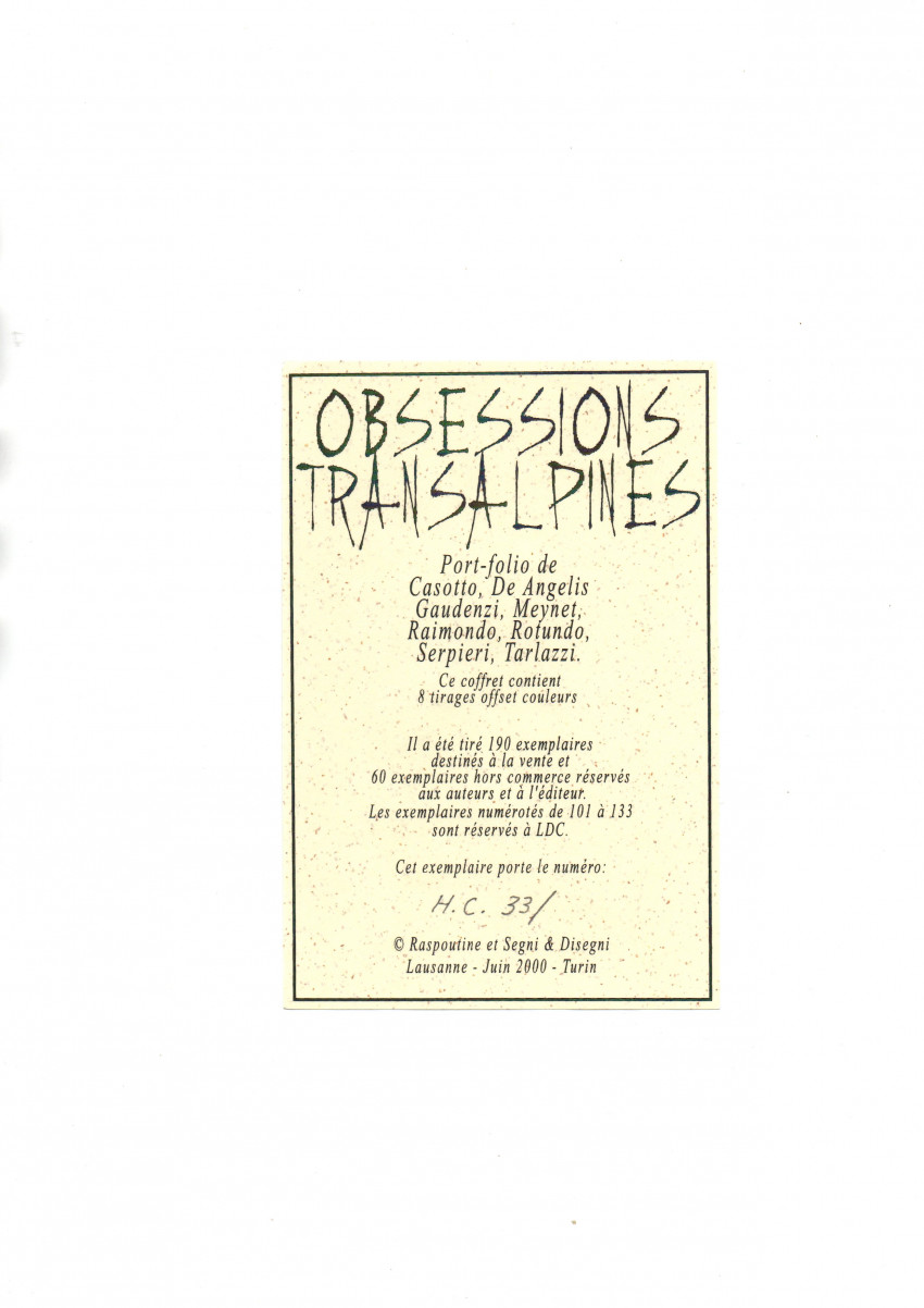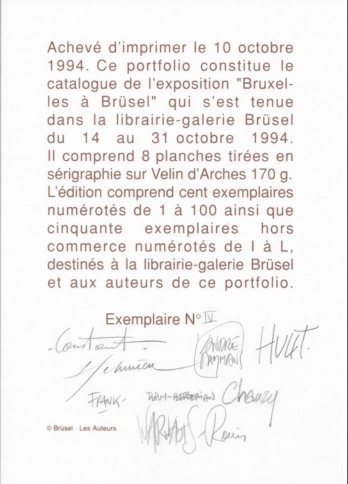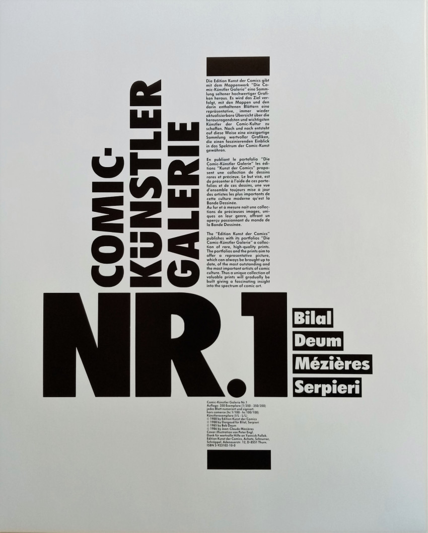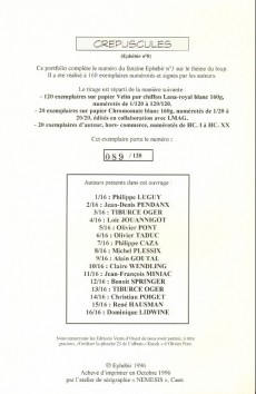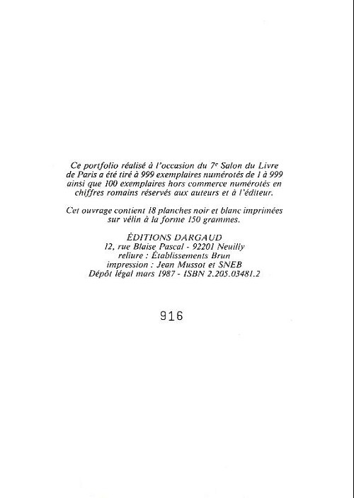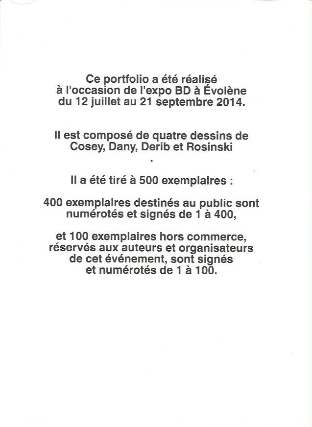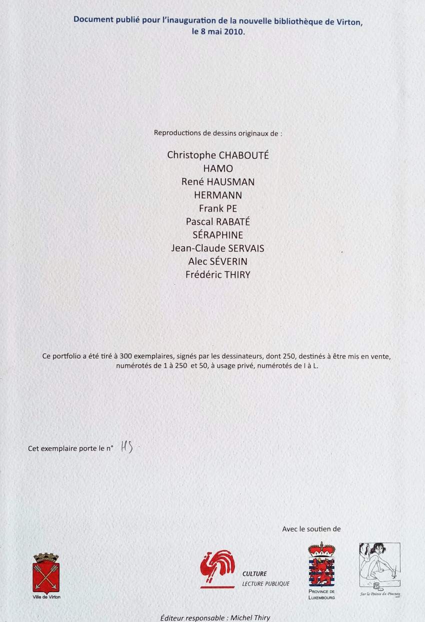 Commentaire : Portfolio réalisé à l'occasion du 10e anniversaire du BD Club de Genève. Tirage 500 exemplaires. Chemise souple contenant 10 dessins non numérotés et non signés et 2 feuillets descriptifs. Pas d'indication du mois de parution.