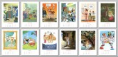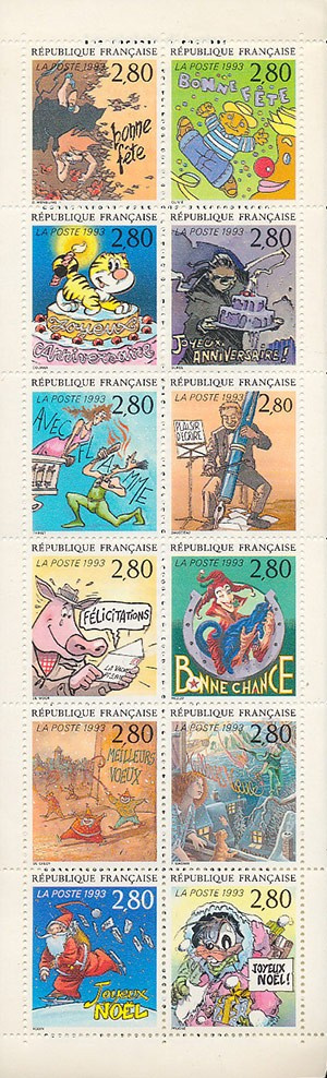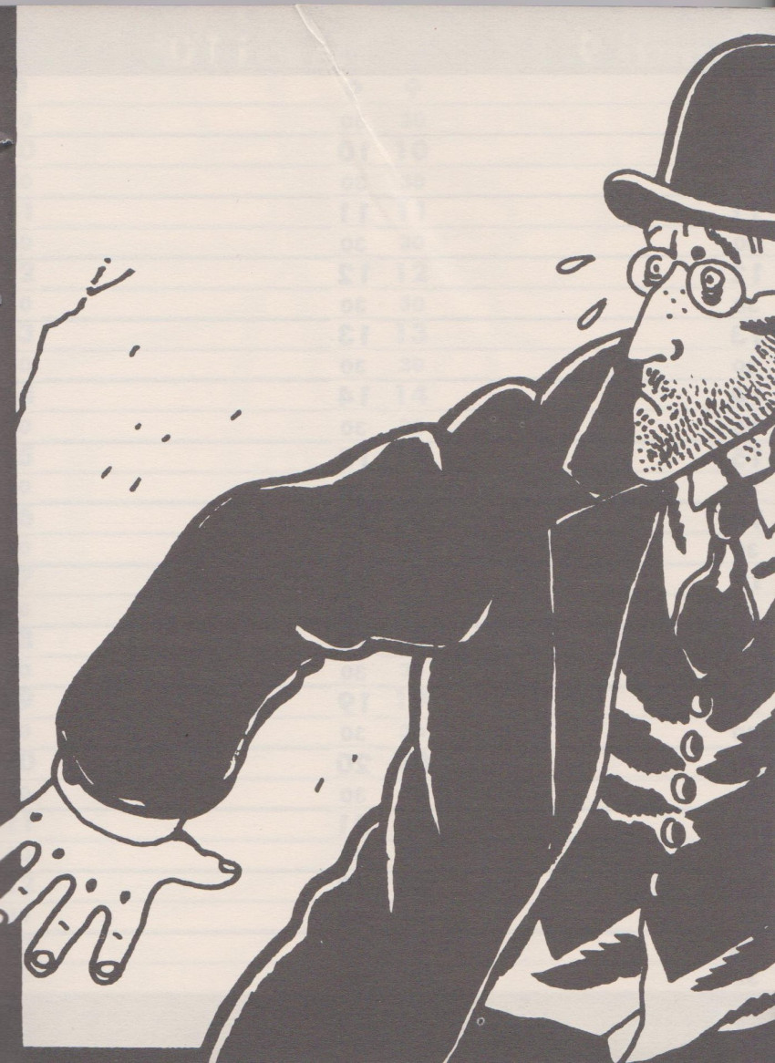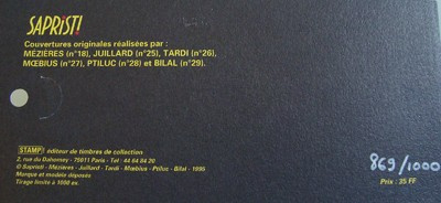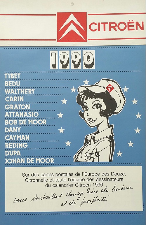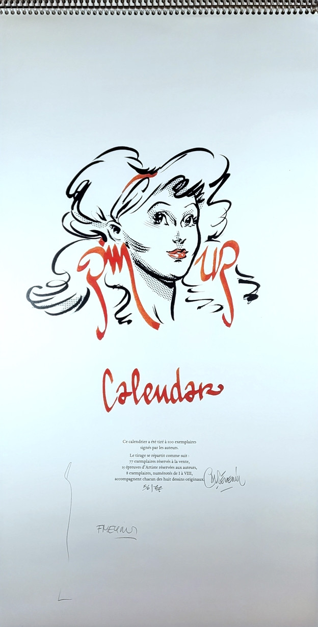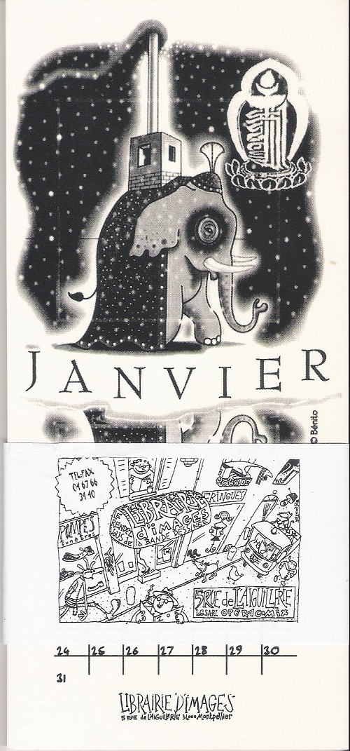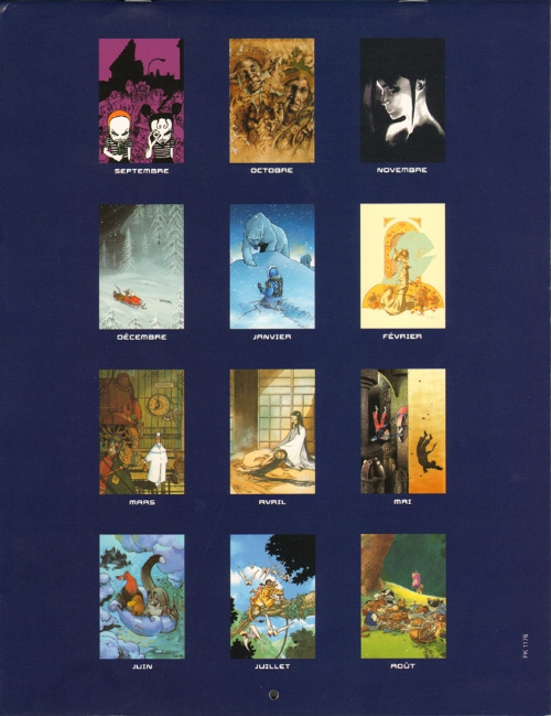 Commentaire : Pour chaque mois il a une illustration; Nicolas Vial, Gilles de Kerversau, Marcellino Truong, Jean-Pierre Formica, Marianne Maury-Kaufmann, Claude Laydu, Yash Godebski, Vincent Bioulès, Ben, François Boisrond, Titouan Lamazou, Moebius, Jean Rouaud. Aussi de nombreuses illustrations sous forme de timbre.