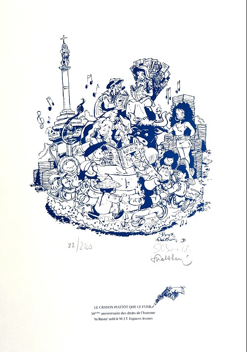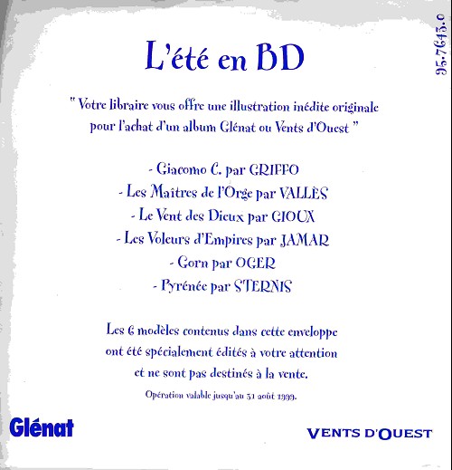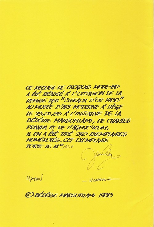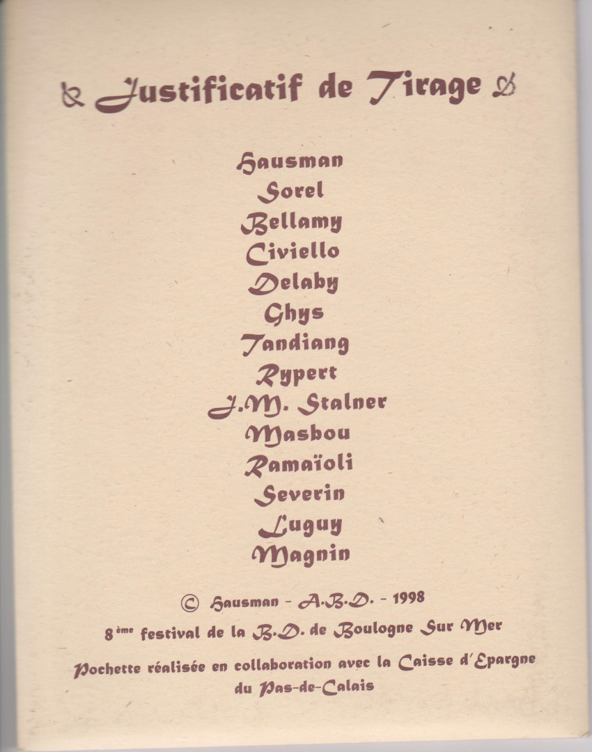 Commentaire : Edité parrallèlement à "La BD du 3ème millénaire". Dessins de Dany, De Gieter, De Moor, Derib, Ferrandez, Geluck, Goetzinger, Mandryka, Mathieu, Meynet, Mix et Remix, Sokal, Taymans,Tronchet.