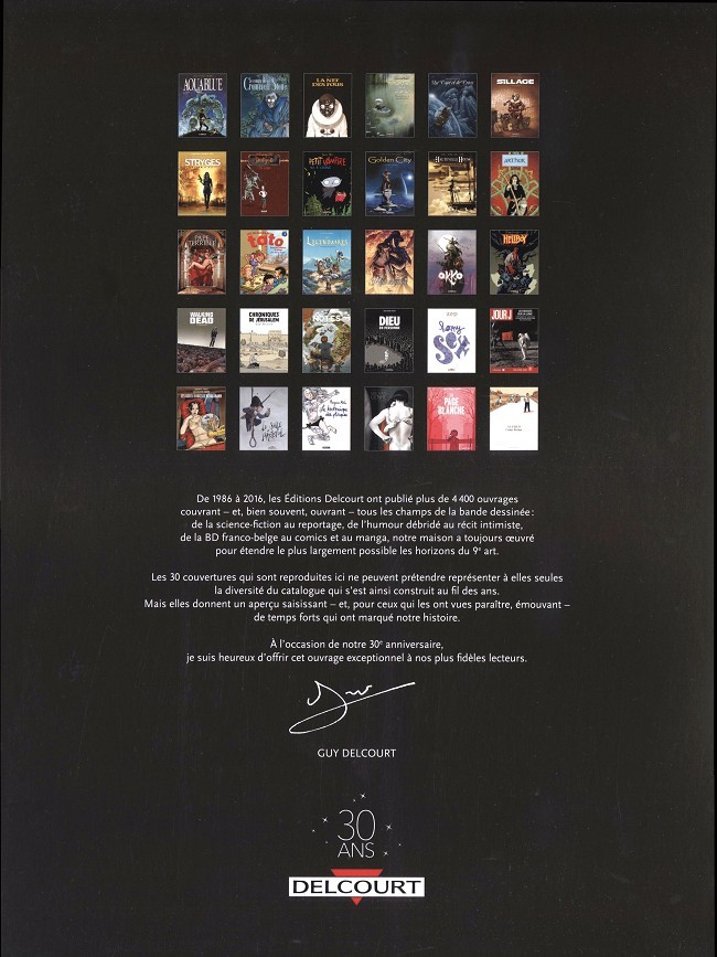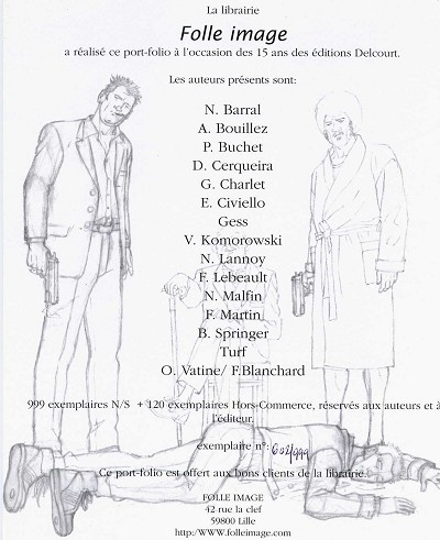 Commentaire : Offert par la librairie Folle Image à l'occasion des 15 ans de Delcourt. 15 illustrations signés de Barral, Bouillez, Buchet, Cerqueira, Charlet, Civiello, Gess, Komorowski, Lannoy, Lebeault, Malfin, Martin, Springer, Turf, Blanchard/Vatine