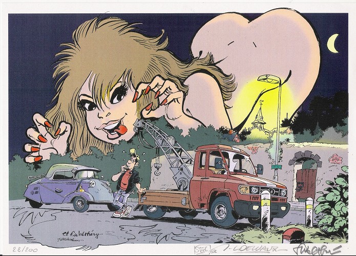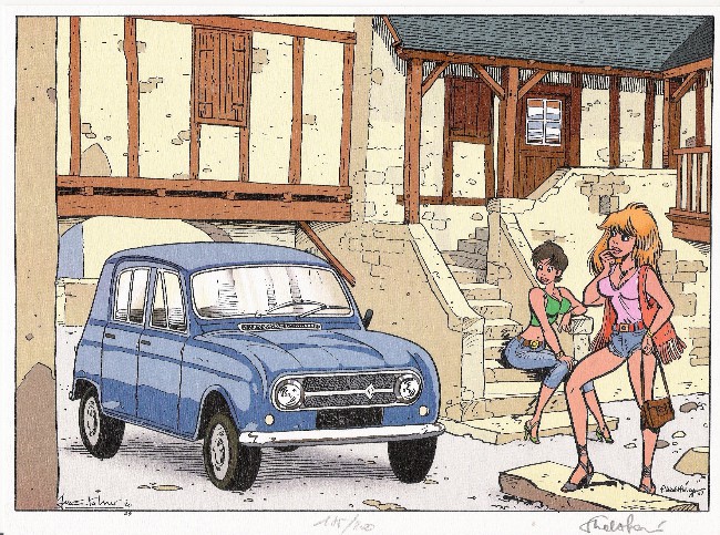 Commentaire : La "Renault 4L". Ex-libris faisant partie de la série "voiture" en couleur. Ces ex-libris sont réalisés par deux auteurs : F. Walthéry pour les décors et les pin-ups, l'autre auteur pour la voiture. ici Jean-Marc Stalner pour la 4L. Il existe une version à 350 exemplaires signées par les deux auteurs, et une version à 200 exemplaires signées uniquement par F. Walthéry.