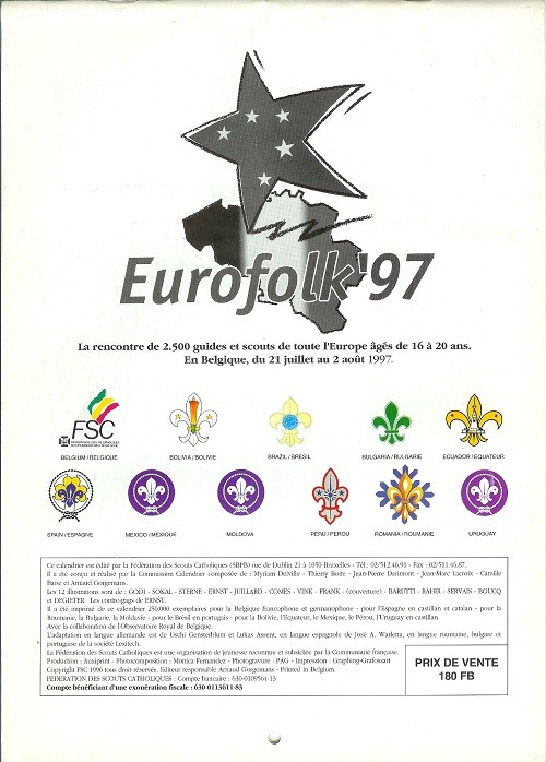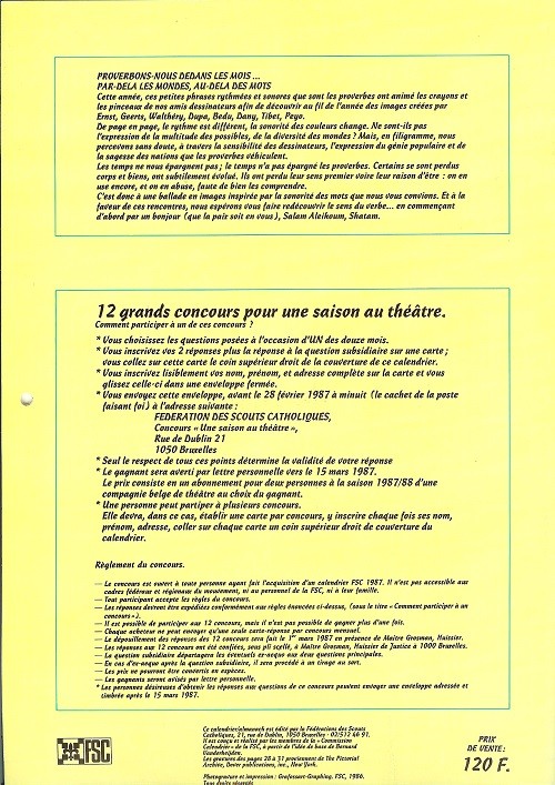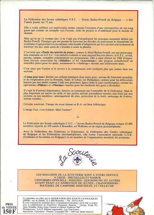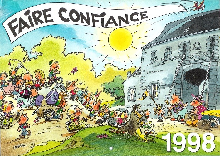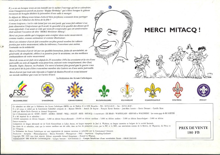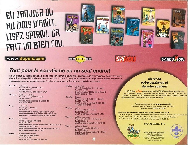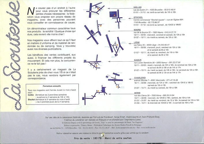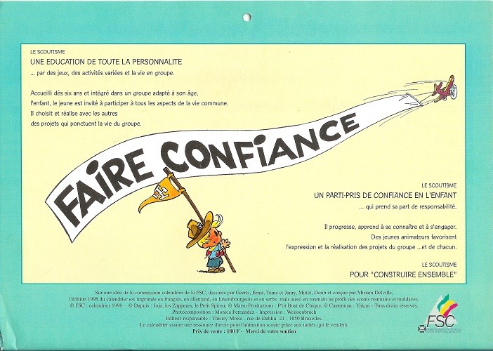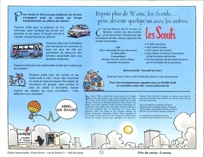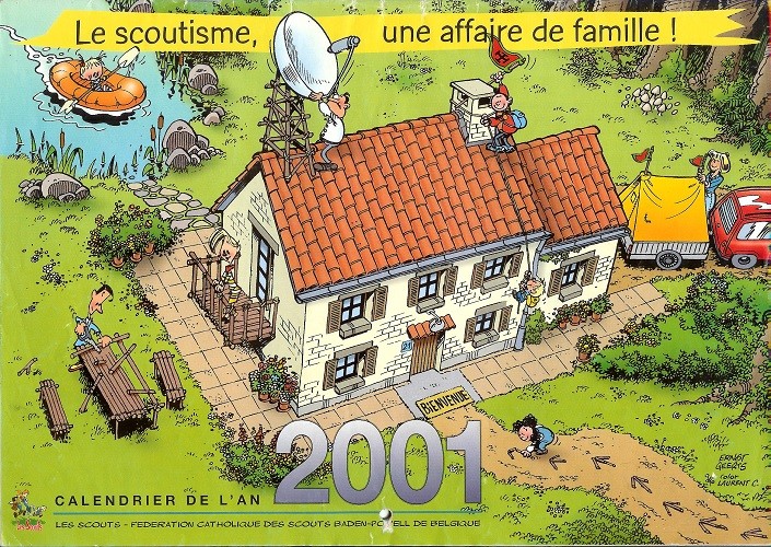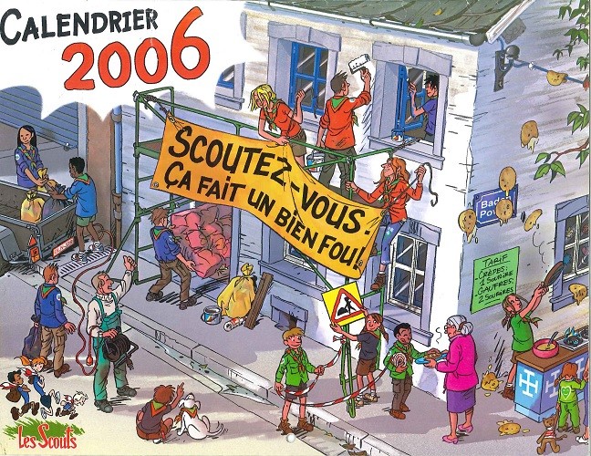 Commentaire : Numéro anniversaire : 100 ans de scoutisme. Sélection d'illustrations des calendriers précédents accompagnés de dessins de Tome et Janry + Dan (2). Couverture de Laudec. Intérieur: Ernst (1997), Kox (1995), Peyo (1963), Ers (2006), Will (1949), MiTacq (1958), Walthéry (1999), Tome et Janry (1998), Geerts (2001), Fran (Pé) (2000), Franquin (1973).
