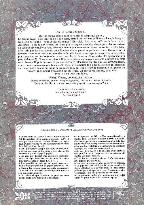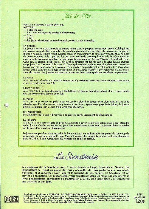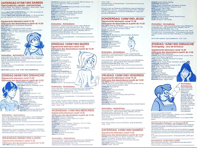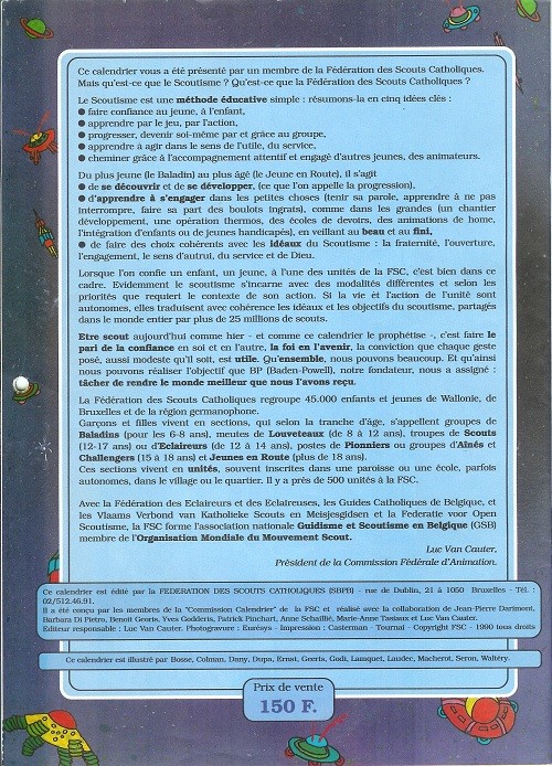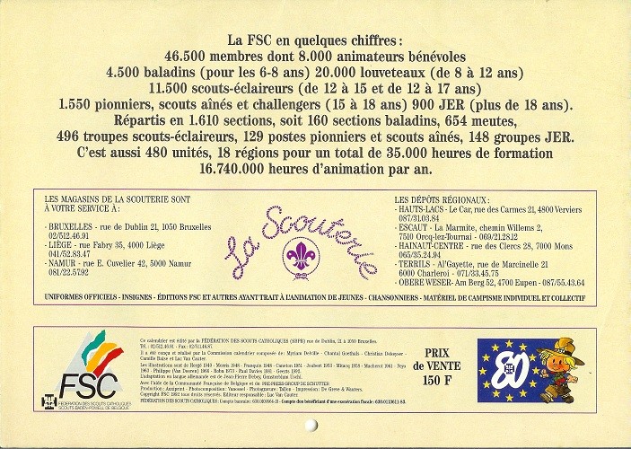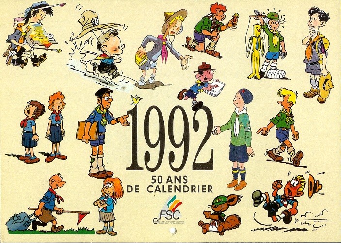 Commentaire : Numéro anniversaire : 50 ans de calendrier. Couverture collective. Intérieur: Hergé (1940), Morris (1948), Franquin (1948), Caneton (1951), Joubert (1953), MiTacq (1958), Macherot (1961), Peyo (1963), Philippe Vandooren (1966), Roba (1973), Paul Davies (1981), Geerts (1992).