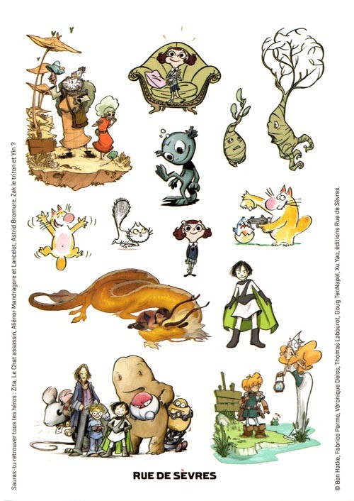 Commentaire : Planche d'autocollants des héros des éditions Rue de Sèvres : Zita (Ben Hatke), Le Chat assassin (Véronique Weiss), Aliénor Mandragore et Lancelot (Thomas Labourot), Astrid Bromure (Fabrice Parme), Zak le triton (Dog TeNapel), Yin (Xu Yao).