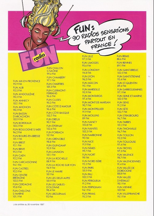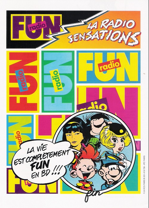 Commentaire : Flyer indiquant la liste de stations Fun Radio en France. Avec les personnages de A. Franquin, Janry, W. Lambil, R. Leloup et F. Walthéry.