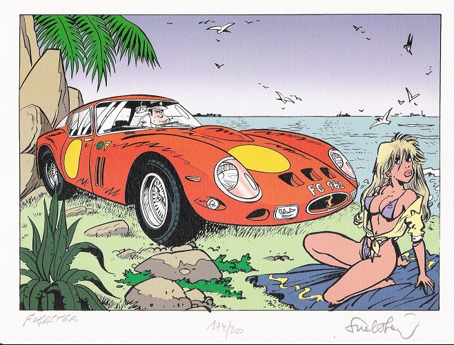 Commentaire : La "Ferrari 250 GTO de 1962". Ex-libris faisant partie de la série "voiture" en couleur. Ces ex-libris sont réalisés par différents auteurs : F. Walthéry pour les décors et les pin-up, le ou les autres auteurs pour la voiture et d'autres éléments. Ici, P. Foerster. Signé par les 2 auteurs.