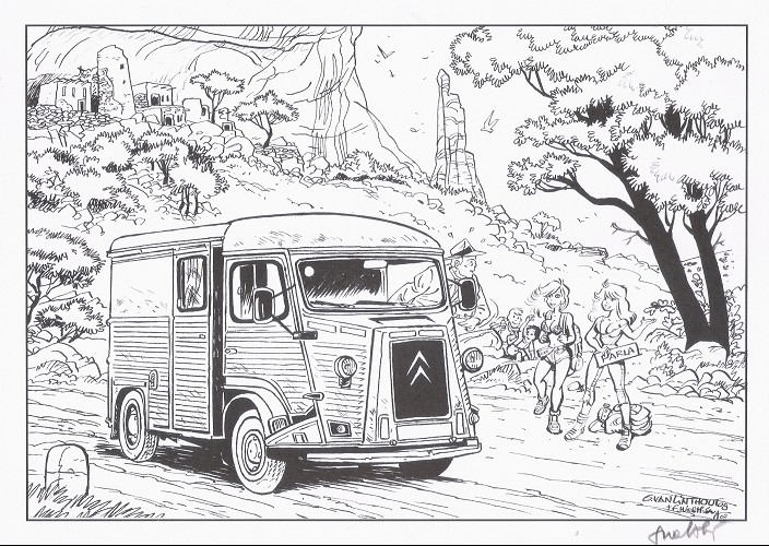 Commentaire : Le "Citroën H". Ex-libris faisant partie de la série "voiture" en noir et blanc. Ces ex-libris sont réalisés par différents auteurs : F. Walthéry pour les décors et les pin-up, le ou les autres auteurs pour la voiture et d'autres éléments. Ici, G. van Linthout. Signé par F. Walthéry.