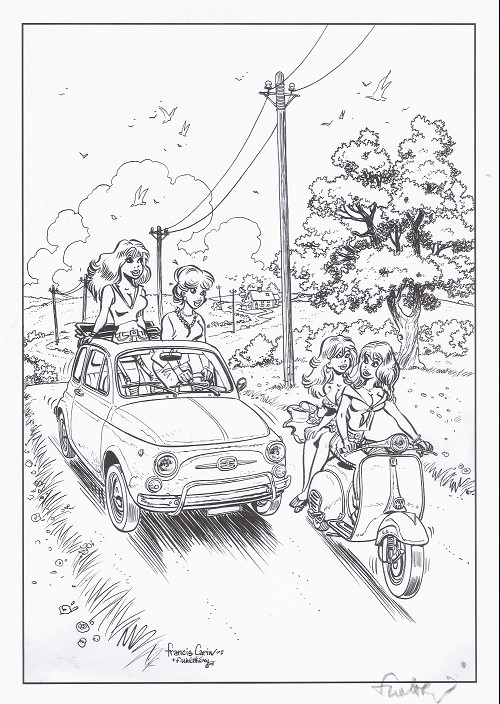 Commentaire : La "Fiat 500". Ex-libris faisant partie de la série "voiture" en noir et blanc. Ces ex-libris sont réalisés par différents auteurs : F. Walthéry pour les décors et les pin-up, le ou les autres auteurs pour la voiture et d'autres éléments. Ici, F. Carin. Signé par F. Walthéry.
