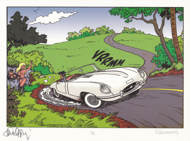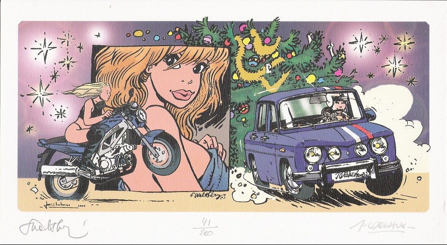 Commentaire : La "Renault 8 Gordini". Ex-libris faisant partie de la série "voiture" en couleur. Ces ex-libris sont réalisés par différents auteurs : F. Walthéry pour les décors et les pin-ups, le ou les autres auteurs pour la voiture et d'autres éléments. Ici, JL. Delvaux et JM. Stalner. Signé par Delvaux et Walthéry. Il existe une version non numérotée mais signée par les 3 auteurs .