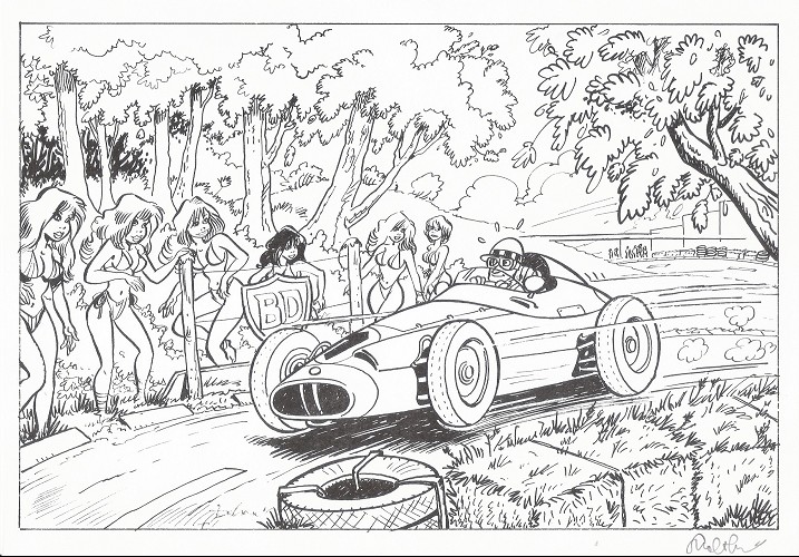 Commentaire : La "Ferrari / Dino 156 F2". Ex-libris faisant partie de la série "voiture" en noir et blanc. Ces ex-libris sont réalisés par différents auteurs : F. Walthéry pour les décors et les pin-up, le ou les autres auteurs pour la voiture et d'autres éléments. Ici, l'auteur collaborant avec Walthéry n'est pas identifié. Signé par F. Walthéry.