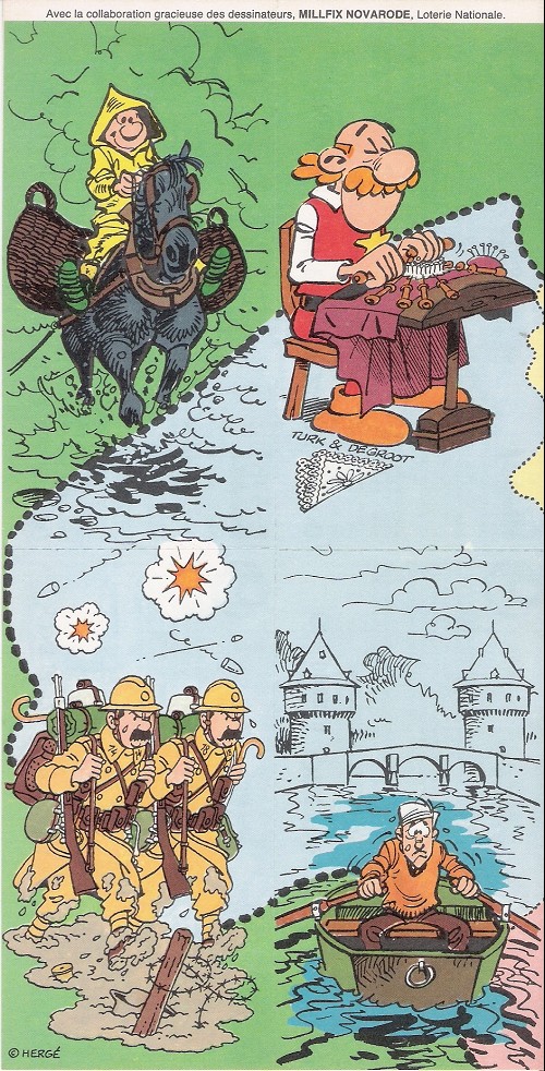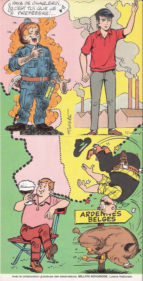 Commentaire : Planche de 4 autocollants. Au verso, il y a 4 tickets de tombola vendus par des bénévoles, tombola organisée par l'Opération 48.81.00 au profit des handicapés de Belgique et avec la participation de la Loterie Nationale. Fait partie d'un ensemble de 10 planches qui, assemblées, représentent la Belgique et ses sites remarquables (c.f. visuel 2). Auteurs présents sur cette planche : Lambil, Turk, De Groot et Hergé.