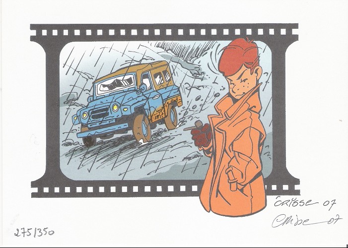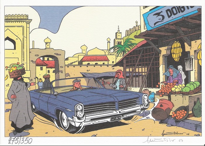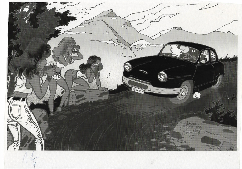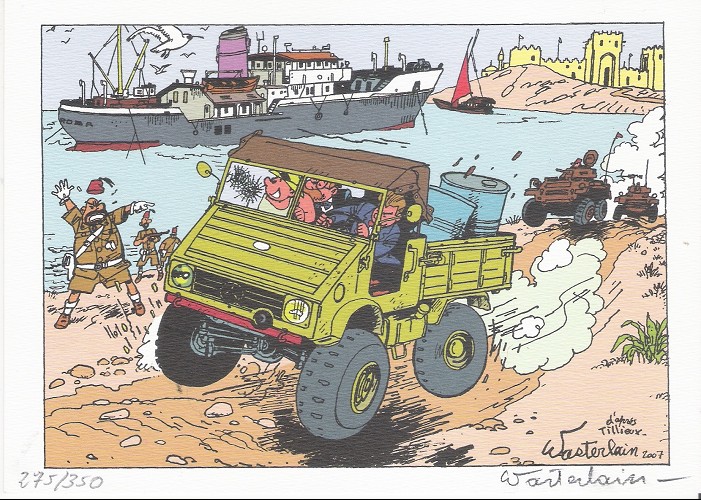 Commentaire : Fait partie des 14 illustrations contenues dans le portfolio. Marc Wasterlain - Mercedes Unimog 411 - Le gant à trois doigts.